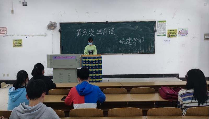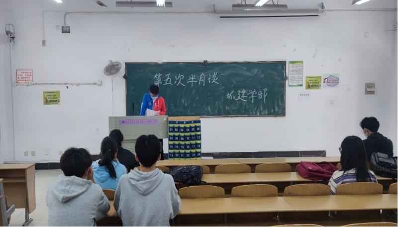 (党群在线讯)2022年5月13日中午12时10分,城建学部党建会在南4203教室开展本学期第五次半月谈,此次活动由党章学习实践部和秘书部共同举办。本次活动以“疫情生活,自律人生”为主题。