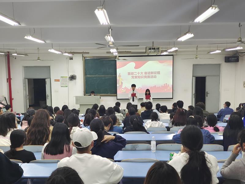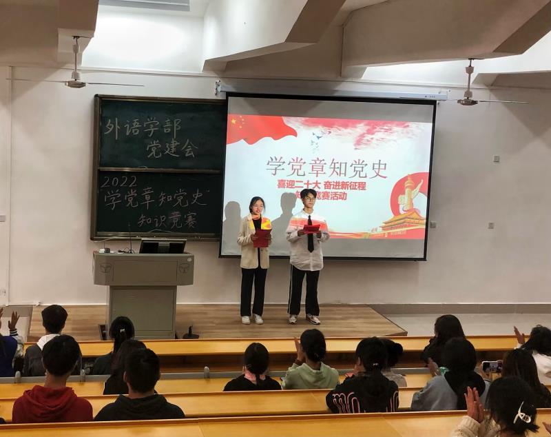 (外语党建讯 撰稿人:汪莹)习近平总书记在党史大会上强调“要引导青少年知史爱党,知史爱国,坚定地走好新时代的长征路”。恰逢二十大召开在即,为了更好的提高同学们对党章党史的认识,筑牢理论知识基础,保持创先争优的意识。武汉城市学院外语学部于2022年10月11日12:10分在红安校区5-J127教室、于2022年10月14日18:00在东湖校区南6201教室开展党章知识竞赛活动。同学们积极参加,在活动过程中,参赛选手表现积极,热烈答题,观众热情似火,整个活动现场洋溢着青春的气息。