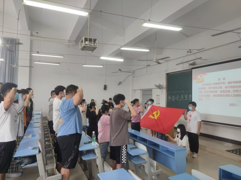 (信息工程学部电)2022年6月9日星期四中午12:10 在南教学楼6302教室举行了2021年12月发展的预备党员入党宣誓仪式。总支秘书宋志肖老师、学生三支部书记李军老师,学生四支部书记范文婷老师以及各位预备党员参加了这次仪式。
