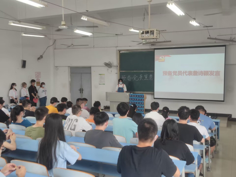 在仪式进行过程中,新党员代表詹诗颖同学发言,她郑重承诺:我们将以优秀党员为榜样,用党员的标准严格要求自己,将自己的智慧和热血融入到社会主义建设中去,融入到党和人民的事业中去,用实际行动践行自己今天的誓言,兑现自己青春的承诺!