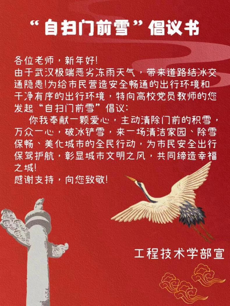 (通讯员 杨维、刘梦晨)为认真贯彻落实习近平总书记对低温雨雪冰冻灾害防范应对工作作出的重要指示精神,工程技术学部党总支积极发出“自扫门前雪”的倡议和号召,动员学部教师党员深入居民区、学校开展志愿铲雪除冰活动。