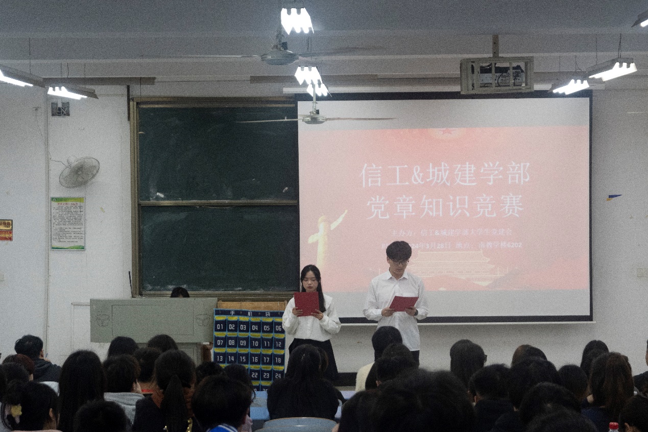 新闻网讯(通讯员:田怡繁 摄影:周思语)为深入推进学习贯彻党章,增强党员的党性意识和纪律观念,2024年3月28日下午5:40信工&城建学部于南610教室举行党章知识竞赛。本次党章知识竞赛由陈志鹏和陈雨轩两位同学共同主持。本次知识竞赛的嘉宾分别是:两院党建会会长张憬扬,两院退役大学生士兵委员会主席胡行知,机电学部党建会会长陈思桐,外语学部党建会会长何子伦,信工学生会主席团宿浩然、张珍惜,信工分团委学生副主席葛琳霞,信工党建会会长陈羿宇,城建党建会会长吴雨,信工党建会副会长陈铭典、肖文玲、戴谋萱,城建党建会副会长徐红玲、向羽。