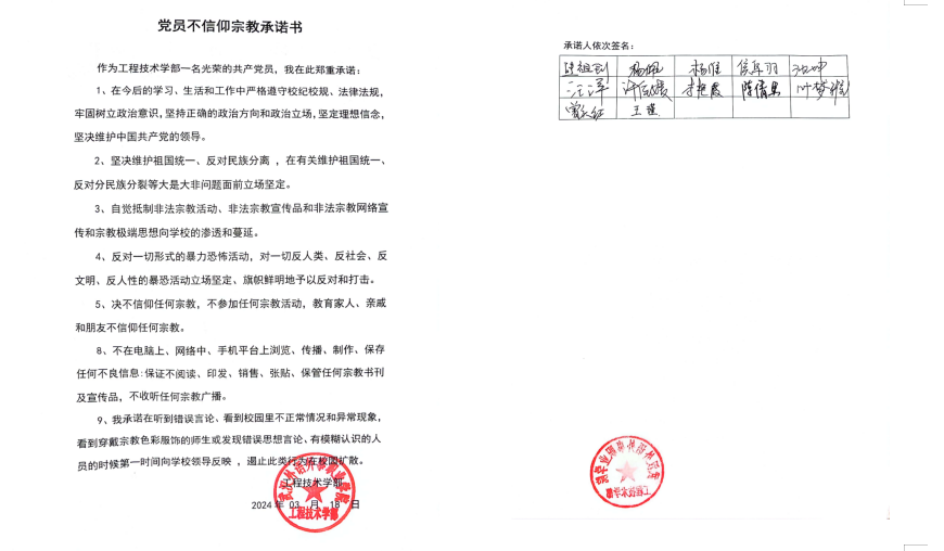 最后杨佩宣读了《共产党员不信仰宗教、不参加宗教活动承诺书》,并组织全体党员现场在承诺书上面签字。