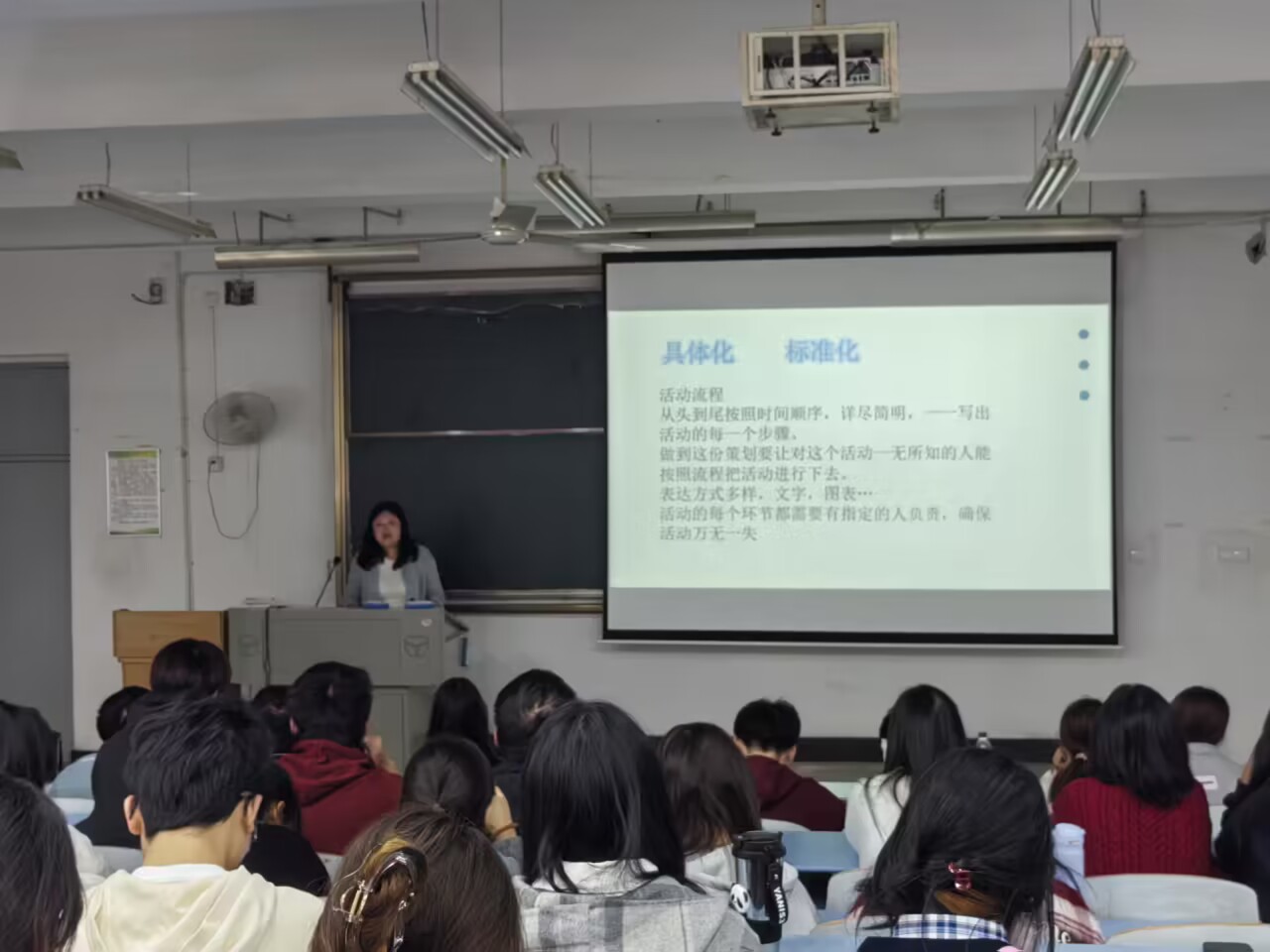 然后,闫艺老师补充强调了活动策划的具体化和标准化流程的重要性。她指出,一份详细的活动策划案应包括从准备到结束的每一个环节,以确保每个步骤都有明确的负责人,从而保证活动的万无一失。此外,她还提到了表达方式多样化的重要性,鼓励大家在策划活动中采用文字、图表等多种形式进行呈现。这种多元化的表达方式不仅能够提高活动的吸引力,还能使参与者更容易理解和接受活动的内容。
