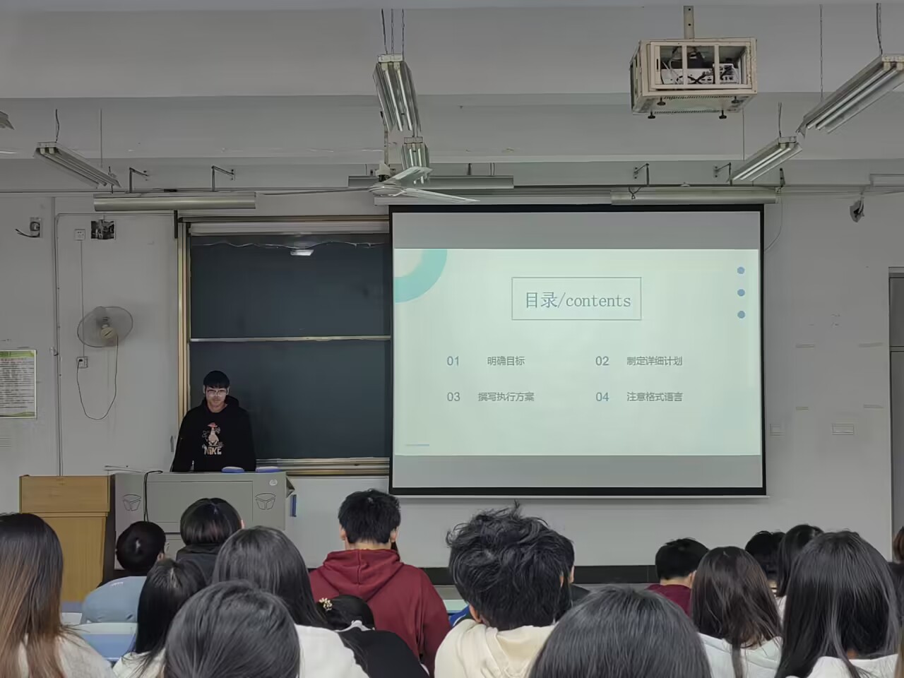 首先,23级商英一班黄浪同学以幽默风趣的语言、丰富的案例,深入浅出地讲解了策划书的写作技巧和方法。他强调,一份优秀的策划书需要具备清晰的逻辑结构、明确的目标定位以及创新的思维模式,详细介绍了策划案的基本框架、撰写技巧和评审标准,让大家对策划案的制作有了更深入的了解。