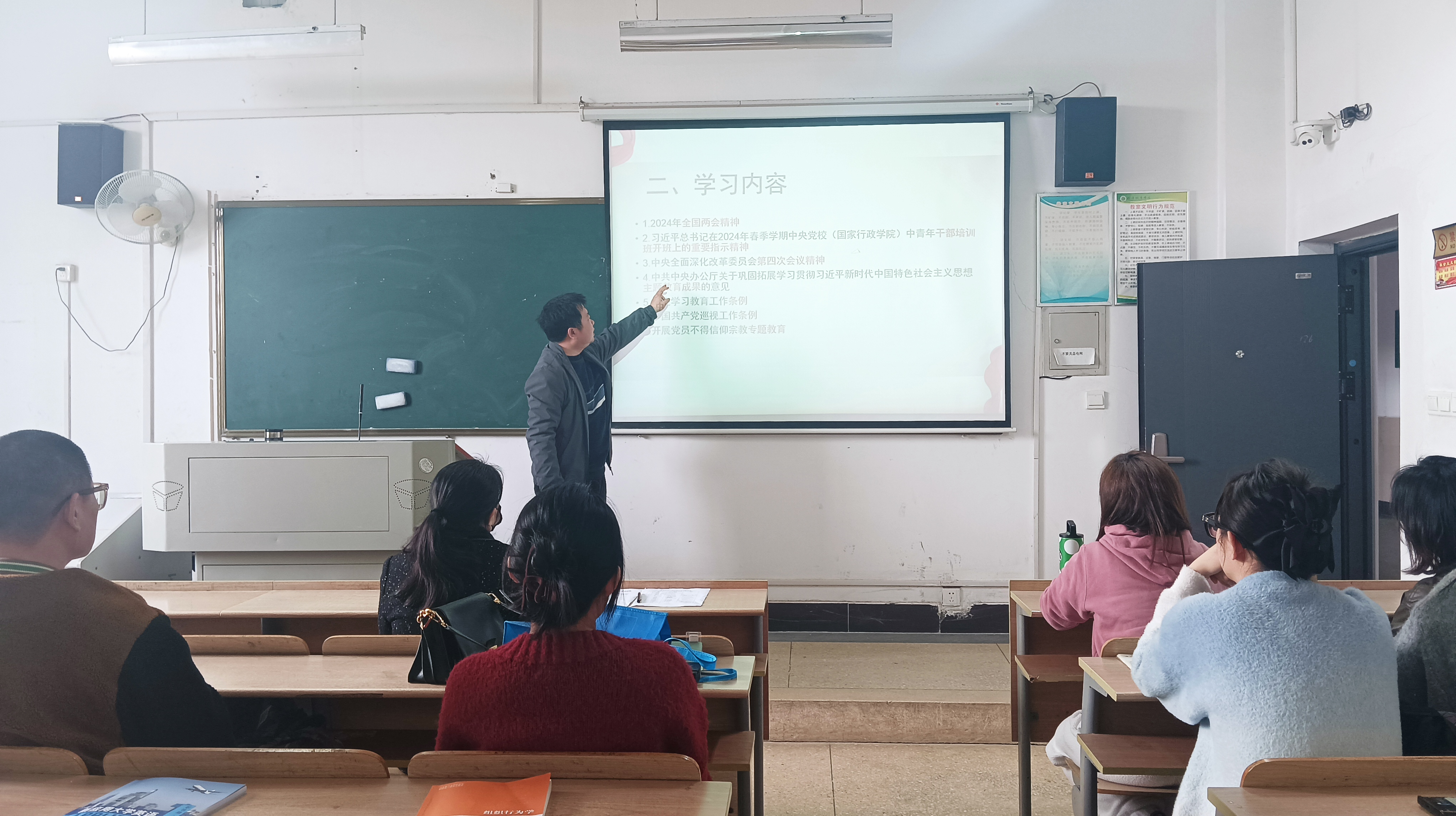 接着,陈亚斌书记指出我们应加强学习2024年全国两会精神、习近平总书记在2024年春季学期中央党校(国家行政学院)中青年干部培训班开班上的重要指示精神、中央全面深化改革委员会第四次会议精神、中共中央办公厅关于巩固拓展学习贯彻习近平新时代中国特色社会主义思想主题教育成果的意见、党史学习教育工作条例以及中国共产党巡视工作条例等内容。他指出我们党员教师应坚持群众路线,建立党员联系群众机制;积极推进课程思政建设,精心打造铸魂育人的“课程思政"精品课;加强网络宣传平台阵地的建设等具体措施。