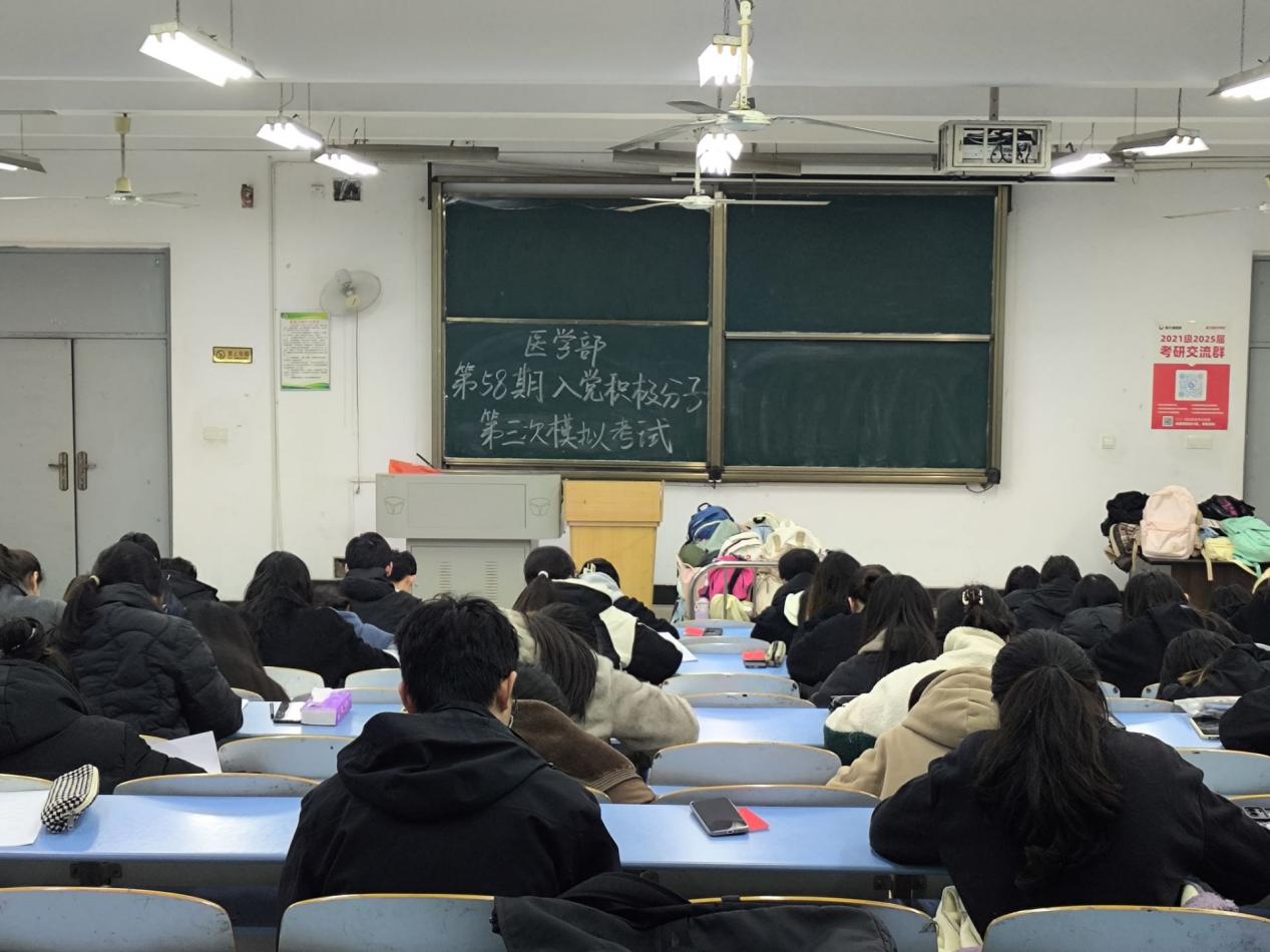 新闻网讯(记者纪梦圆)医学部党建会于11月20日在6101和6103举行了第三次模拟考试,本次考试旨在检验大家对党课知识的掌握程度,展现大家的学习态度。