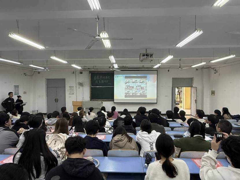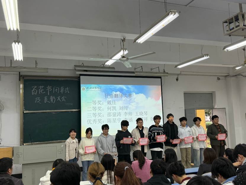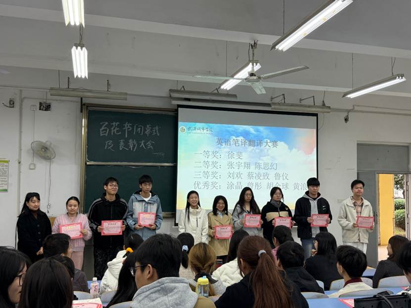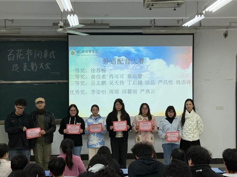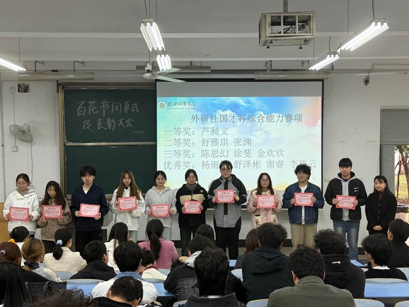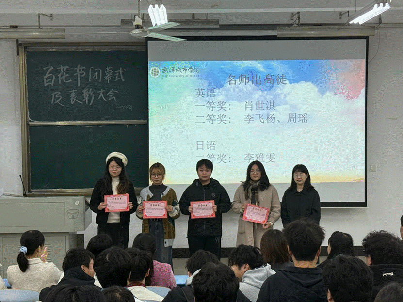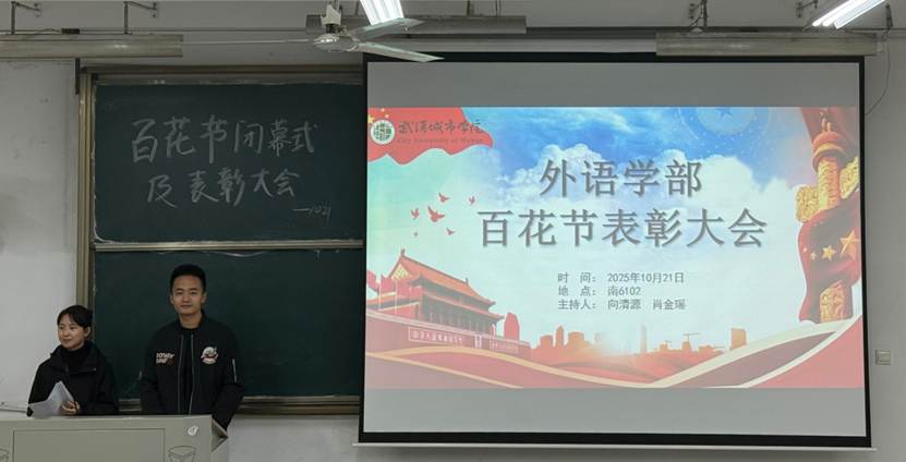 2025年10月21日,武汉城市学院外语学部于南6102教室举行百花节表彰大会。本次大会由向清源、肖金瑶同学共同主持,外语学部师生齐聚一堂,共同回顾百花节期间丰富多彩的学科竞赛活动,并为在各项赛事中表现优异的学子们颁发荣誉。
