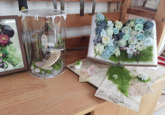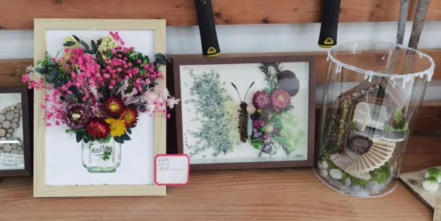 最终展示的参赛作品丰富多彩,有树枝和麻绳编织的风铃、树叶鸟巢挂灯、衍纸工艺加植物材质混合的装饰壁挂、有林间小木屋、有双手托起小鸟的环保雕塑等,还有很多同学从网上购置材料包另行创作的国风挂灯等,大家都采用"木艺+植物+其他"综合材料,创作关于“春天”元素的主题,有的同学甚至用木板锯出扇形或随意形,雕刻出“种春天”“春”,再用彩色颜料绘制与春天相关的花鸟植物,直奔主题。