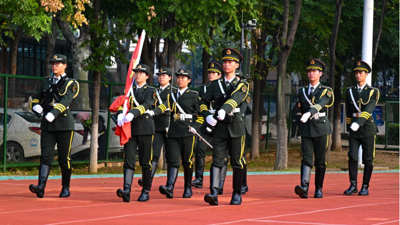 国旗护卫队迈铿锵步伐护送国旗至旗台,国歌奏响时,全体师生肃立行注目礼,五星红旗冉冉升起,彰显仪式庄重感。