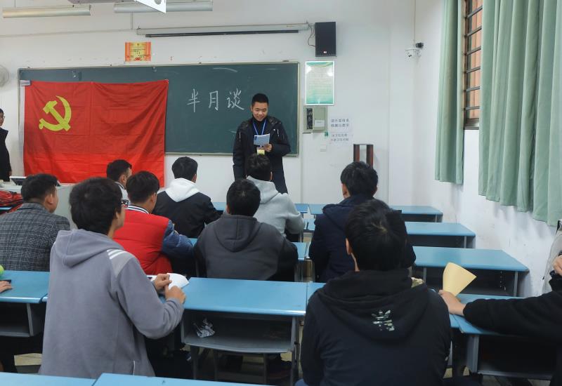 (党群在线讯)2018年11月30日12:10,机电学部党建会于南7101教室开展了以“六十九载砥砺前行,鲲鹏威龙接苍穹”为主题的半月谈活动。参加本次半月谈的人员有:党章部部长管乐,党建会各部门干事十余人。本次活动的主持人由党章部干事涂凯担任。