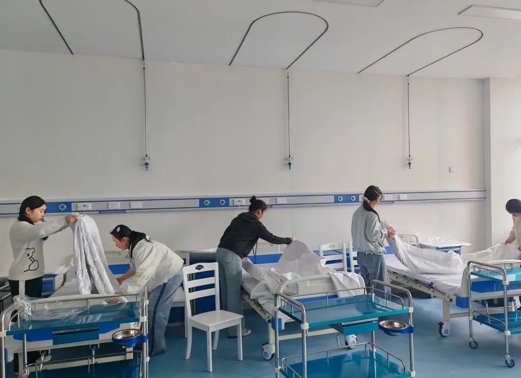 活动中,各小组各司其职配合默契:负责地面清扫的同学细致拖拭墙角、床底、过道,使地板重焕洁净光泽。一部分同学负责门窗墙面专注擦拭高处门窗、栏杆,墙面与玻璃光亮如新。负责整理的同学一一清点实训器材将其归位,操作台、储物区也被收拾整齐。另一部分同学负责规范铺设床品、安置护理假人,精准还原了临床实训场景。