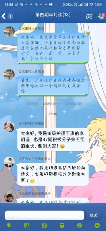 2019年11月14日中午12点整,医学部于线上举行本学期第四次半月谈活动,其主题为“生如夏花,不负青春”,第48期入党积极分子围绕此主题进行了热烈的讨论。本次活动主持人为常务部干事蒋官海。