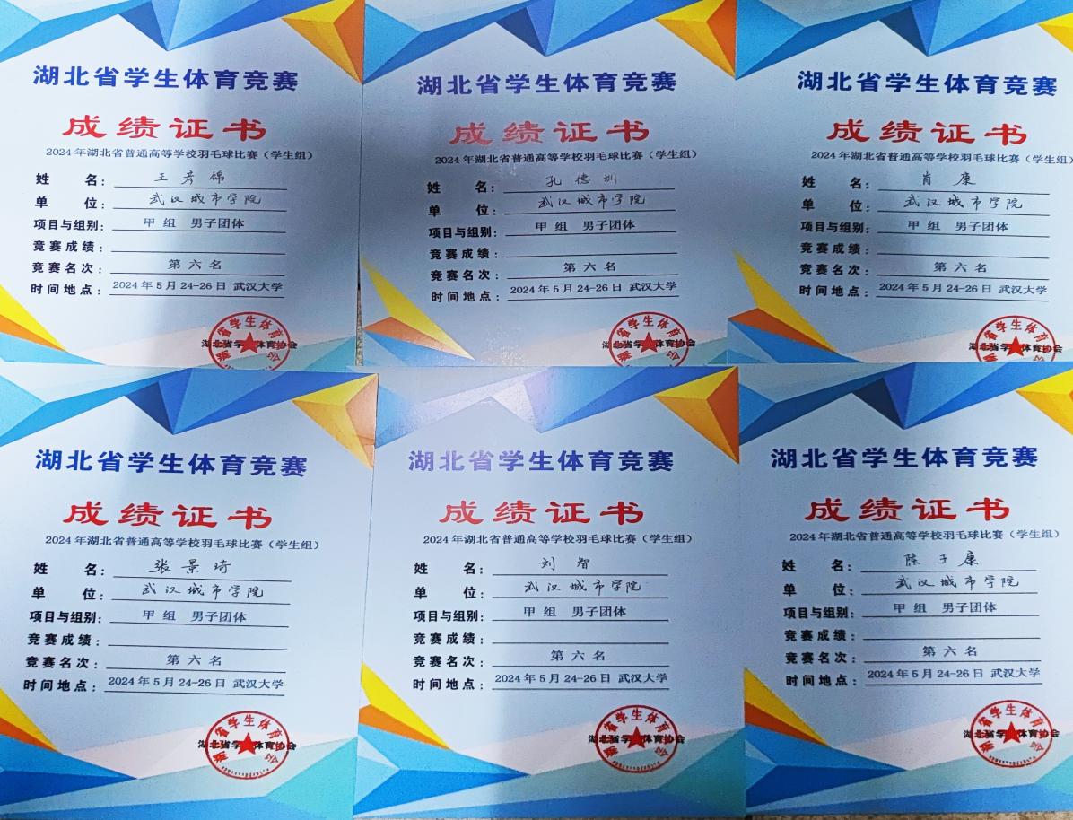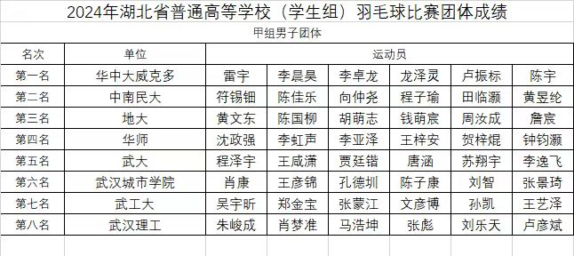 2024年湖北省高校羽毛球比赛于5月24日-26日在武汉大学举行。我校羽毛球队在领队马浩林老师、教练樊力老师的带领下获得甲组(普通本科生)男子团体第六名历史最佳战绩,仅次于华中科技大学、中南民族大学、中国地质大学等5所全国重点院校。