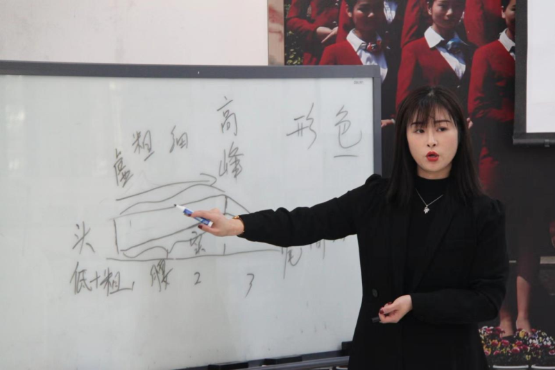 康思超分别讲述了女教师和男教师在工作中最适合的形象,其中着重讲到男性教师的头发前不遮挡眉目、侧不遮挡耳廓、后不遮挡脖颈,容貌干净整洁。女教师的化妆步骤分别为妆前、底妆、遮瑕、唇妆、颊妆、整体造型六个方面。康思超用自己举例,描述了眉毛的画法,从修眉工具的选择,到眉形的选择,康思超在白板上画出图解便于各位教职工的理解。