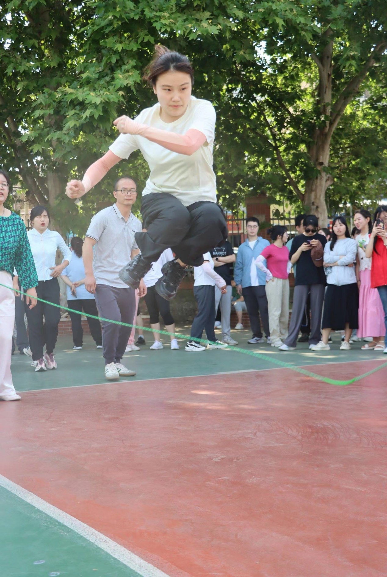 与“绳”共舞,“绳”彩奕奕。17日上午8:40,集体跳绳比赛准时开始。随着哨声响起,参赛的教职工在绳间轻盈地跳跃,展现了他们的青春朝气。即使失误,他们也毫不气馁,重振旗鼓,争分夺秒展示出合作默契。