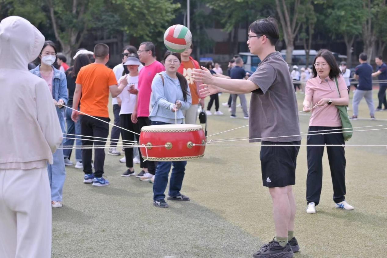 16日下午2:30,同心击鼓比赛精彩上演。10位教职工1人持1根鼓绳,先将排球投掷到空中,再经过移动、拉绳等默契操作接稳排球。排球借助惯性一次又一次地腾空,教职工们稳住节奏,展现出经过长期锻炼后的非凡实力。