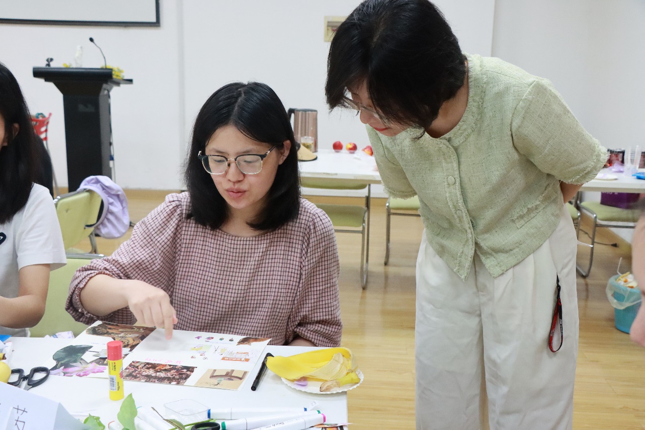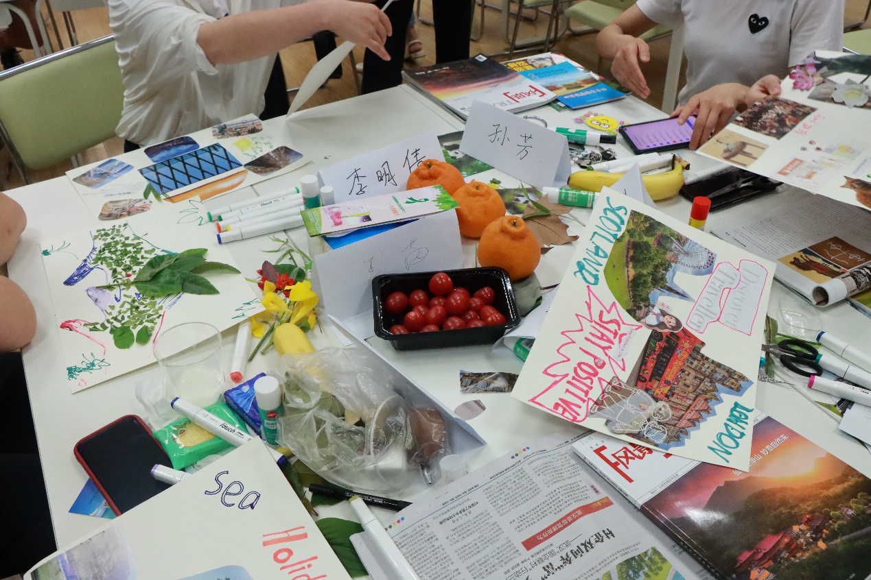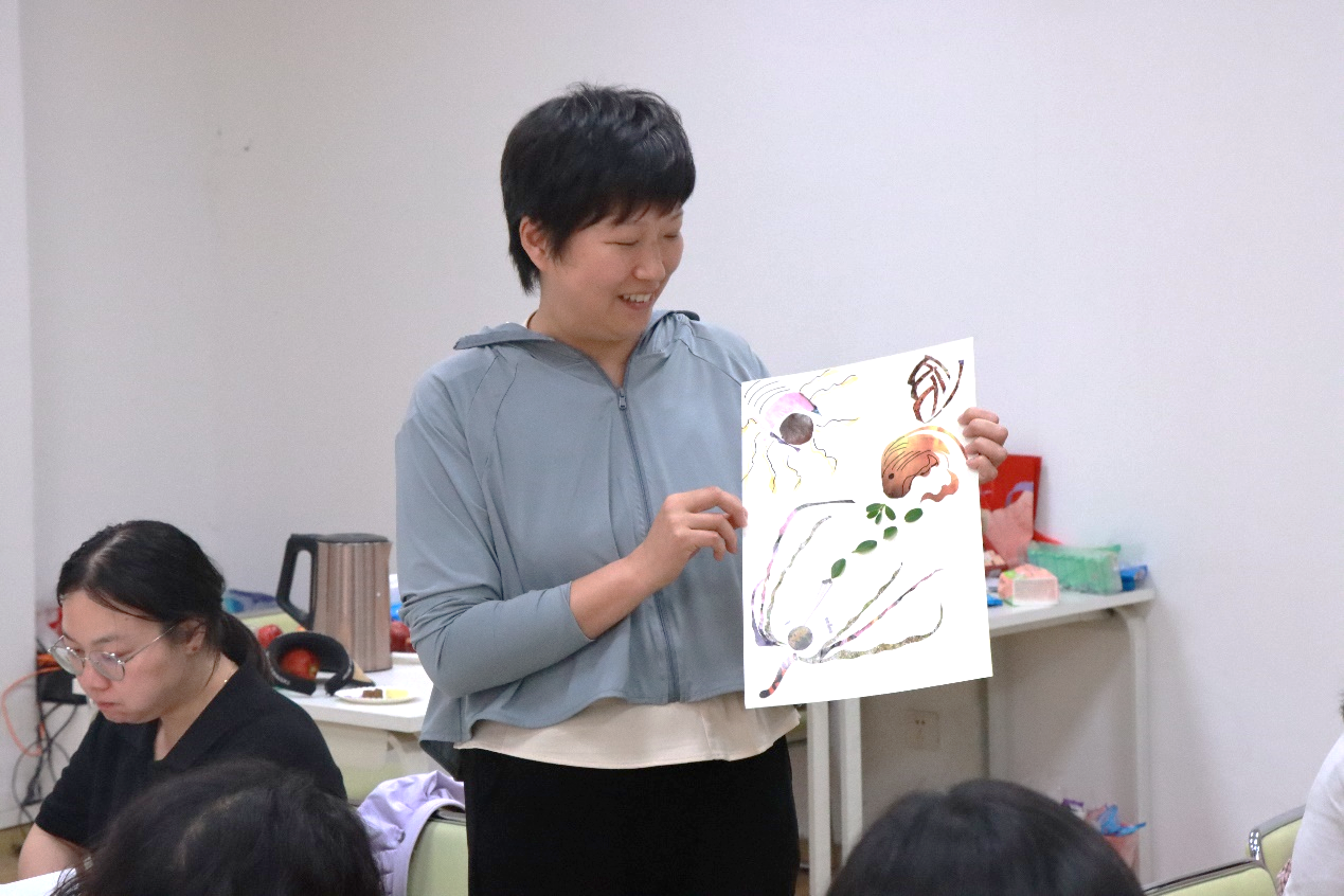 活动现场气氛轻松愉悦,不时传来欢笑声和讨论声。展示环节中,第一组以聂淑媛老师为代表通过贴纸剪贴的方式,巧妙地融入象征性元素,用太阳象征希望与力量,创造两个不同种类的生物——豚鼠和老虎,两者对立相望,暗喻人与人之前要和善沟通,前进的路才充满希望。