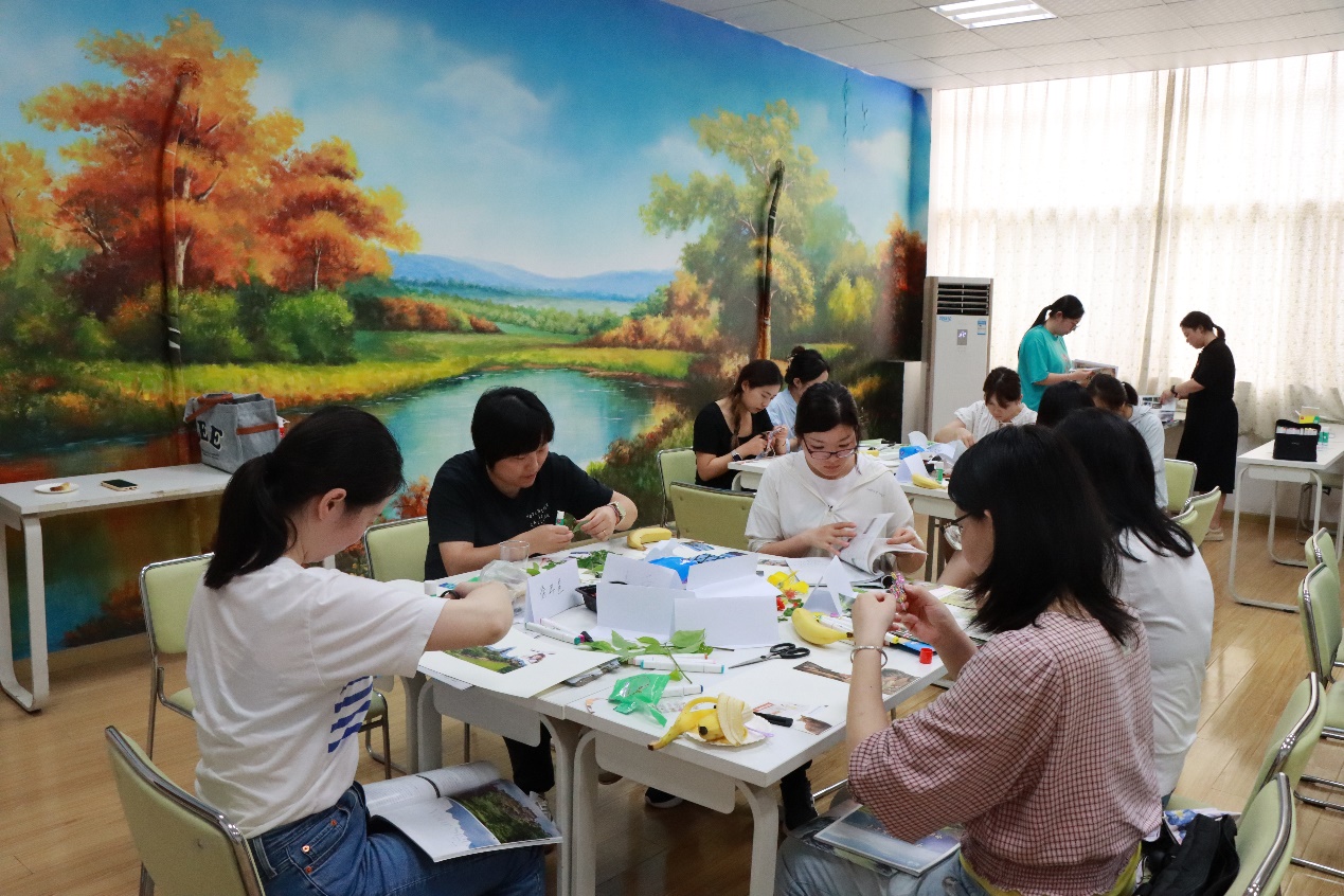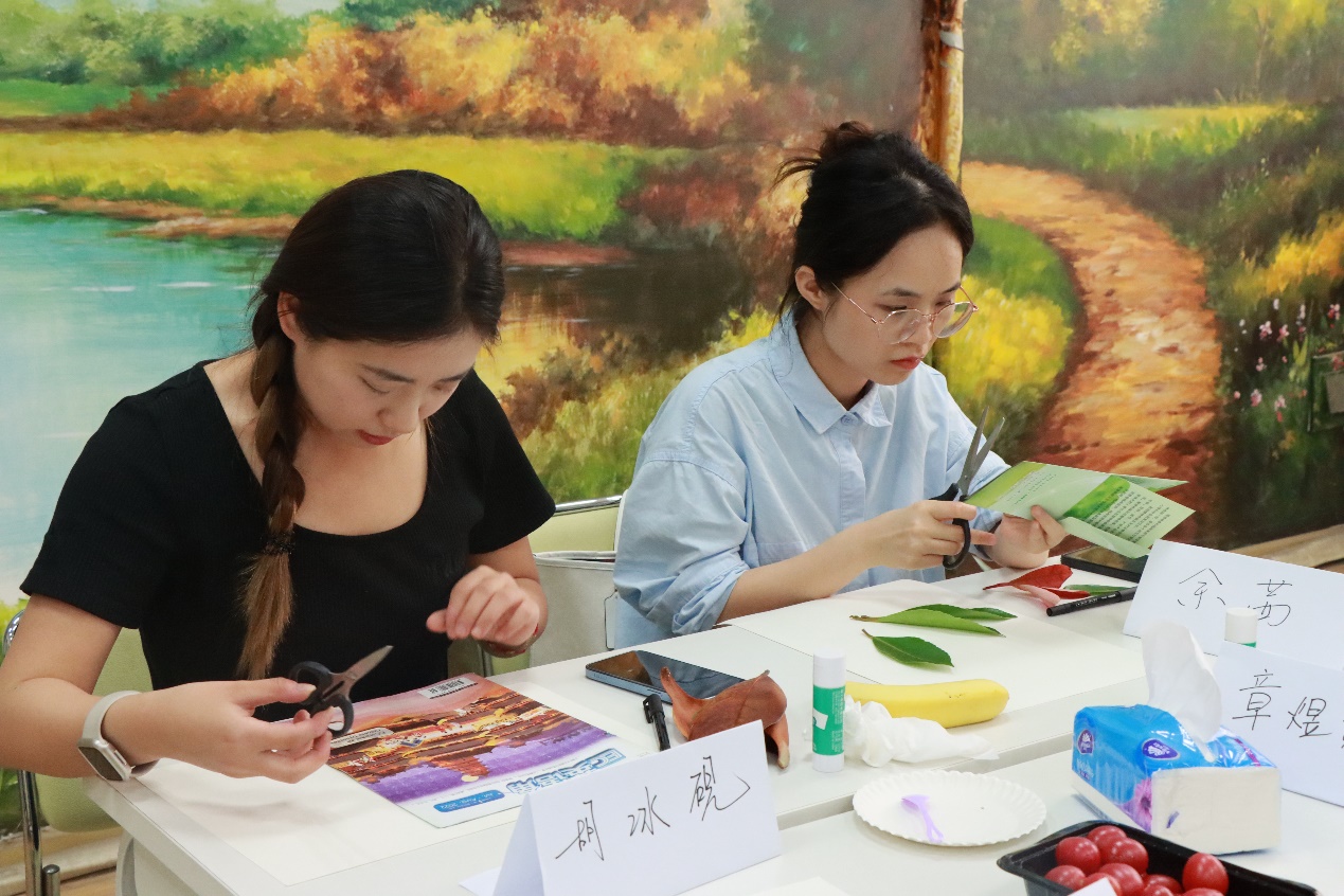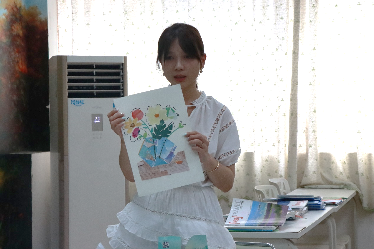 活动现场气氛轻松愉悦,不时传来欢笑声和讨论声。展示环节中,第一组以聂淑媛老师为代表通过贴纸剪贴的方式,巧妙地融入象征性元素,用太阳象征希望与力量,创造两个不同种类的生物——豚鼠和老虎,两者对立相望,暗喻人与人之前要和善沟通,前进的路才充满希望。