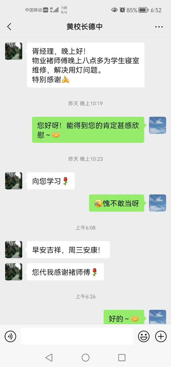 2024年3月26日,维修工褚新利晚上八点位学生解决用灯问题,服务受到德中黄校长的点名表扬。