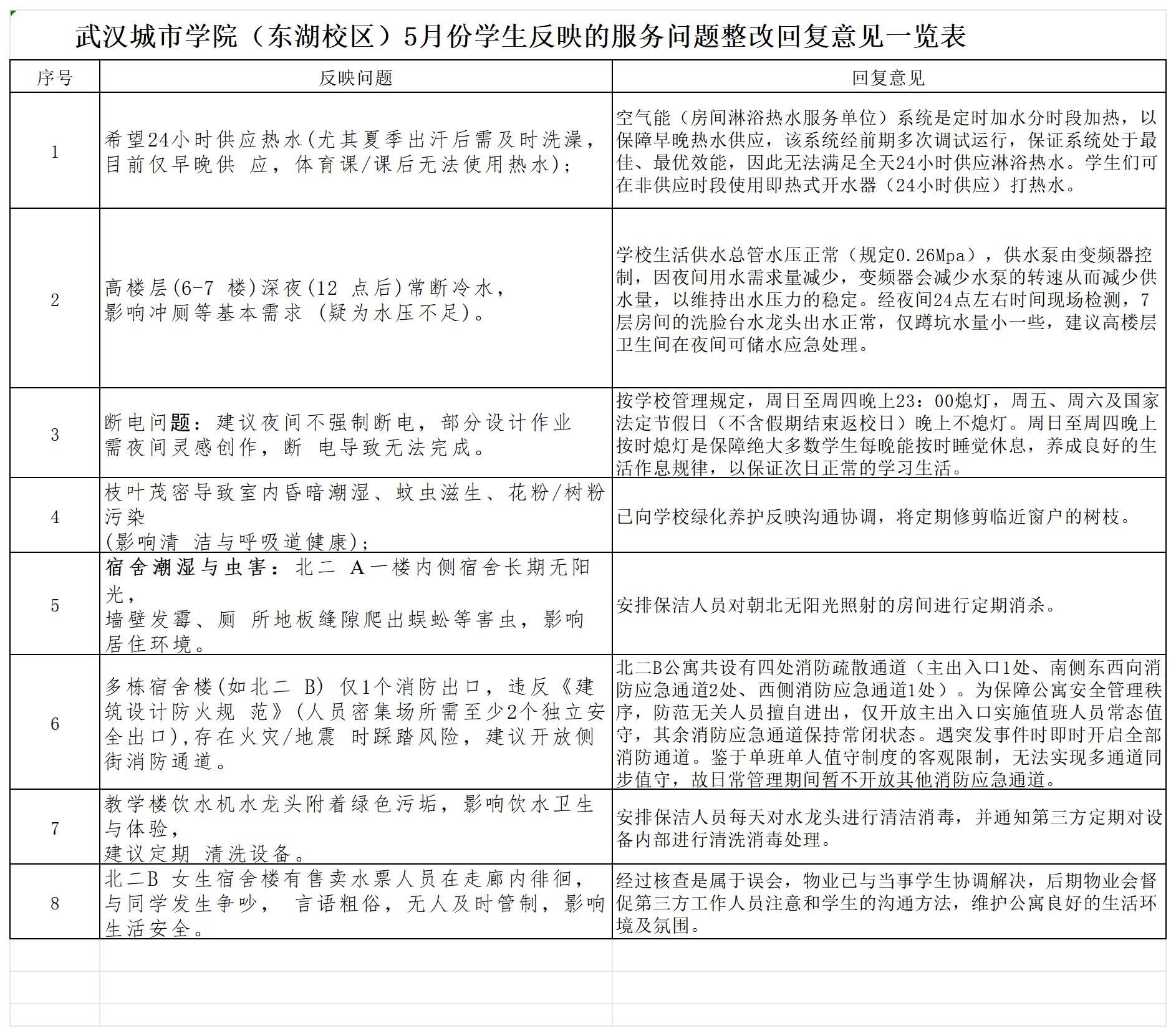 5月份学生意见反馈问题回复意见一览表