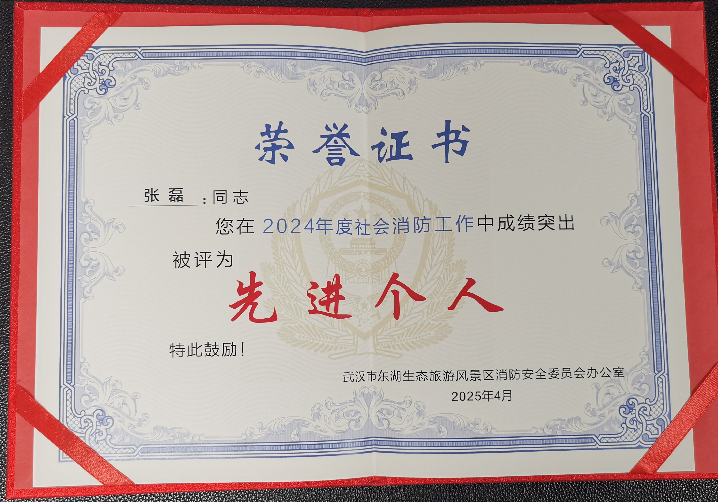 武汉市东湖生态旅游风景区消防救援大队授予武汉城市学院“2024年度社会消防工作先进单位”,武汉市东湖生态旅游风景区消防安全委员会办公室授予学校后勤保卫处张磊同志“2024年度消防工作先进个人”