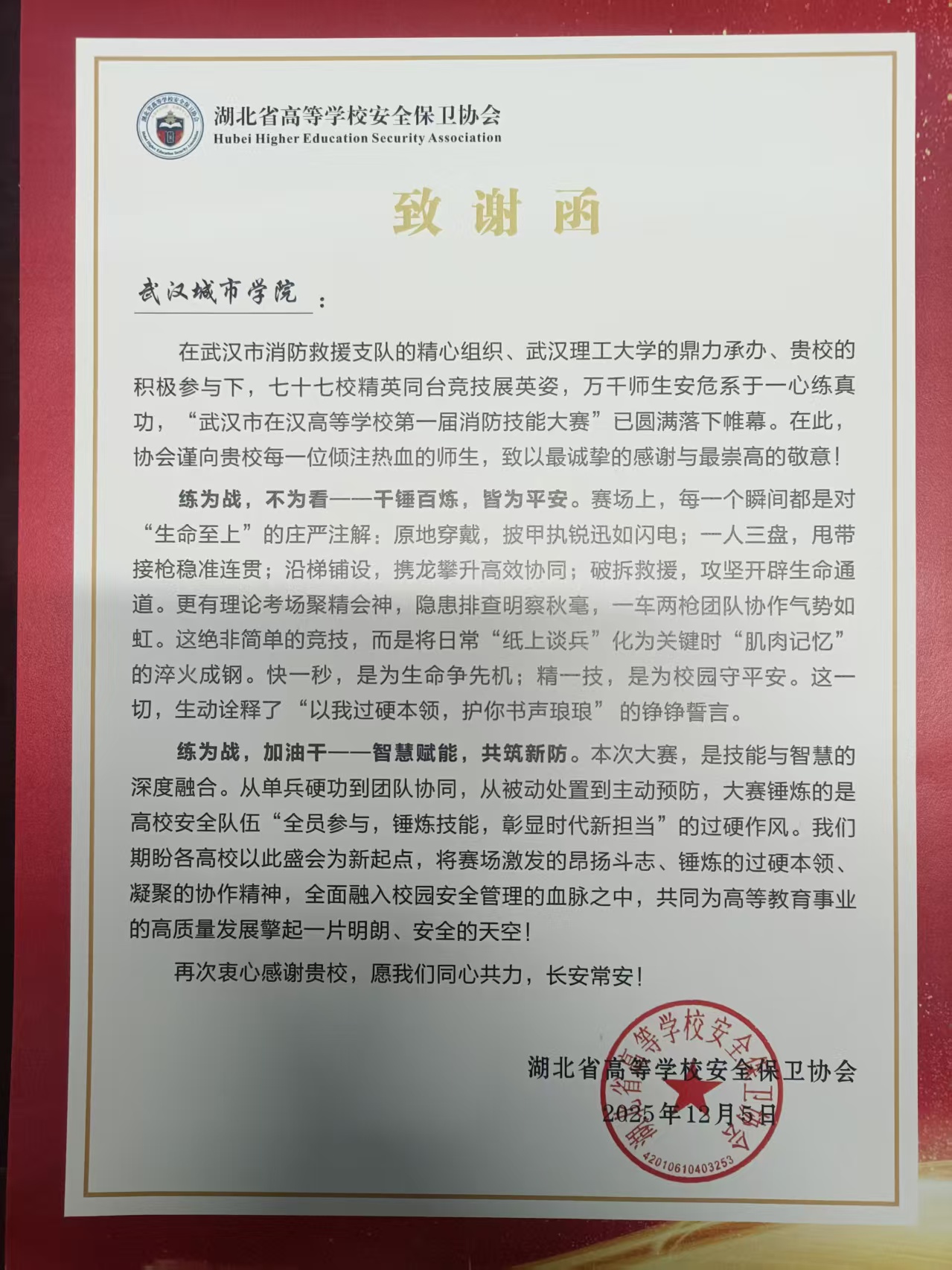 12月3-4日,保卫处组队参加在武汉理工大学举办的“武汉市在汉高等学校第一届消防技能大赛”。校消防队凭借扎实的理论功底与娴熟的实操技能相结合,在参与的77所高校中脱颖而出,综合成绩荣获技能大赛团体一等奖(10所)。