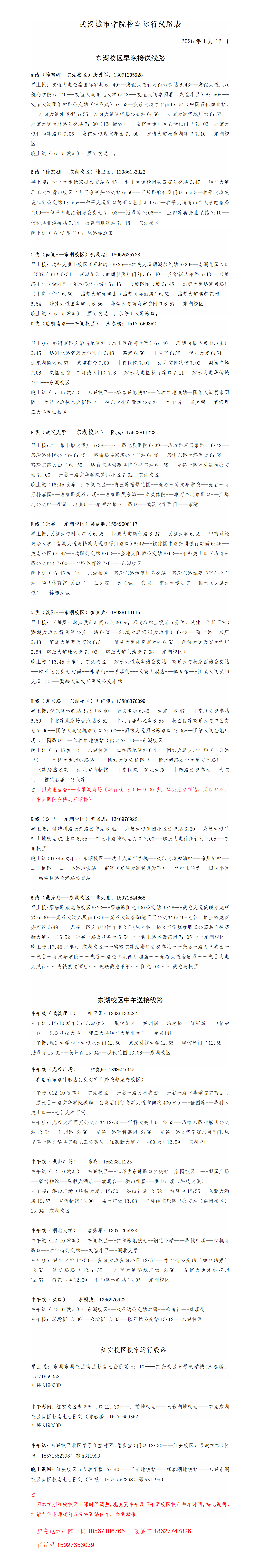 武汉城市学院黄家大湾校区校车运行线路表2026.1.12