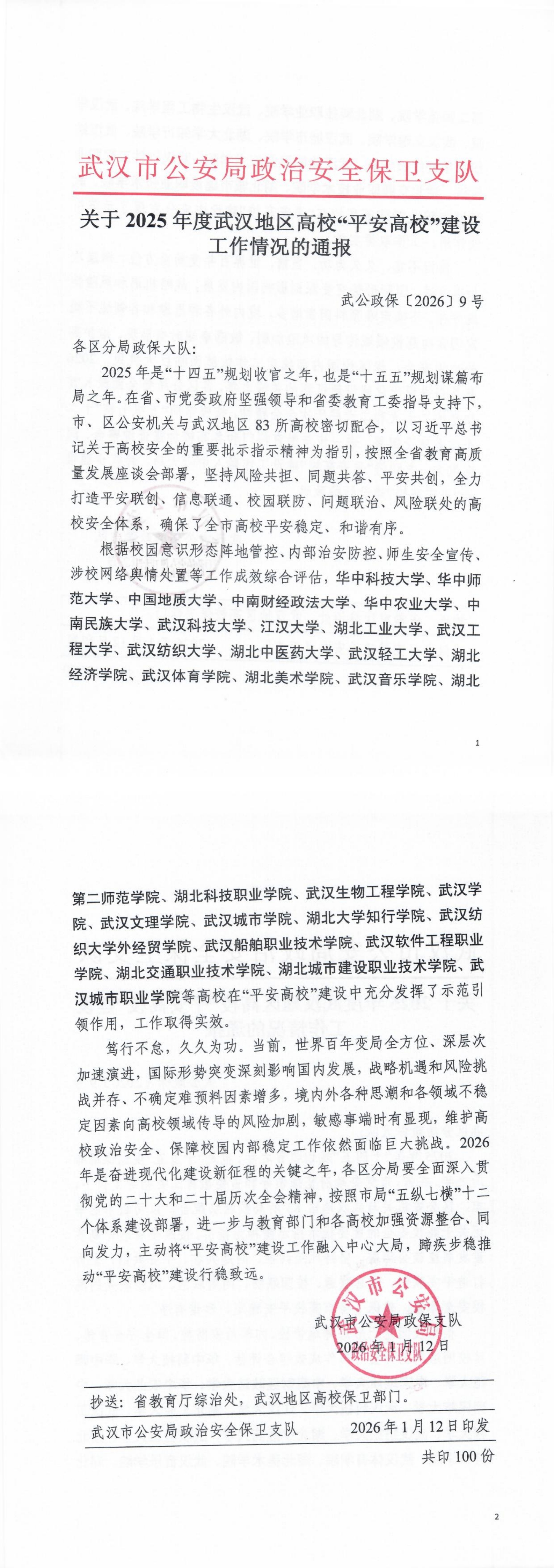 近日,武汉市公安局政治安全保卫支队对2025年度武汉地区高校“平安高校”建设工作情况进行通报。学校在校园意识形态阵地管控、内部治安防控、师生安全宣传教育及涉校网络舆情处置等方面表现突出,被评为“平安高校”建设示范单位。