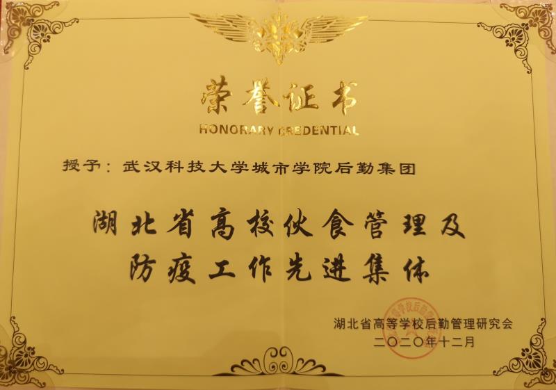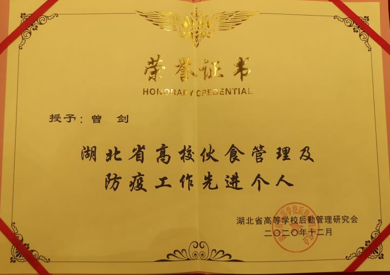 新闻网讯(通讯员皮芳)日前,湖北省教育厅高校后勤研究会在全省高校开展的“高校伙食管理及防疫工作先进单位及个人”评选活动结果公布,我院后勤集团荣获湖北省高校伙食管理及防疫工作先进集体称号,后勤集团副总经理曾剑、学子食堂经理朱林华荣获湖北省高校伙食管理及防疫工作先进个人。