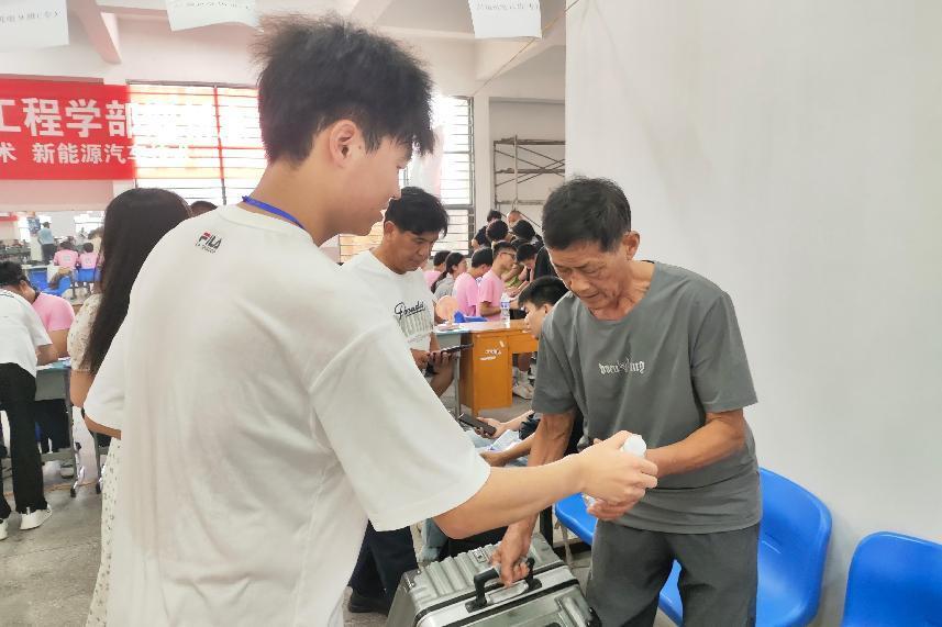 相较于去年迎新工作,今年有所改进。学校增添了许多人性化的设计,在体育馆的外面增添了几班摆渡车,能够方便学生和家长运送行李到宿舍。在体育馆内部新生报到处,学校的领导非常关心学生工作环境,在场馆内现场准备了很多冰块,各师生都得到了舒适的环境。22级智能车辆工程一班的邱凯同学作为志愿者说道:“对于本次活动,我不断地指引新生到宿舍,帮忙搬行李,虽然很累,但是很满足,我认为我做到了作为党员积极分子,全心全意为人民服务的宗旨!”