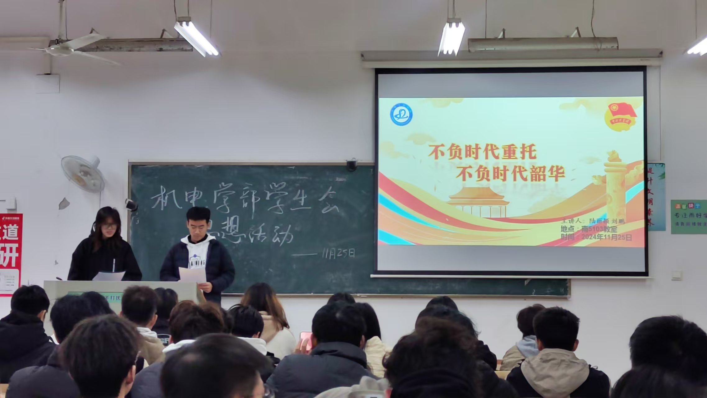 (通讯员 李嘉韦)2024年11月25日12点05分学生会,在我校南5103教室开展了以“不负时代重托,不负时代韶华”为题的思想会。本次思想会从以下三点开展:宣扬传统文化、看齐青年代表、铸造青年品质。