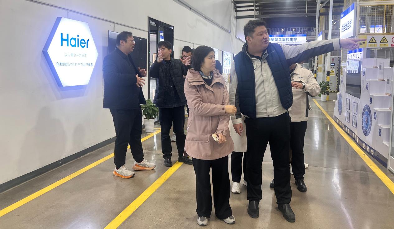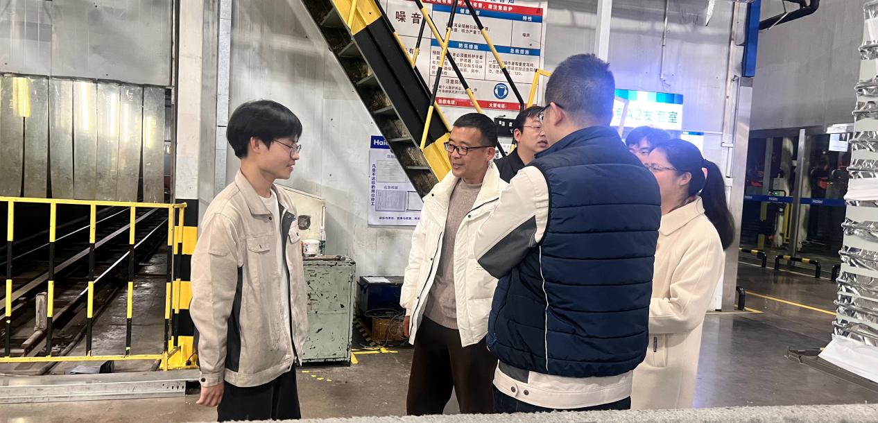 在武汉海尔总经理兰总的陪同下,学部团队参观了企业智能化生产车间。流水线上机械臂精准装配冰柜门体,AGV无人运输车穿梭运送物料,数字化看板实时更新生产数据,智能化场景令教师们直观感受到现代制造业的升级转型。兰总特别介绍,武汉海尔作为海尔集团华中区域核心基地,已建成覆盖冰箱、空调、热水器等产品的智能互联工厂,其自动化率突破75%,年产值逾50亿元。