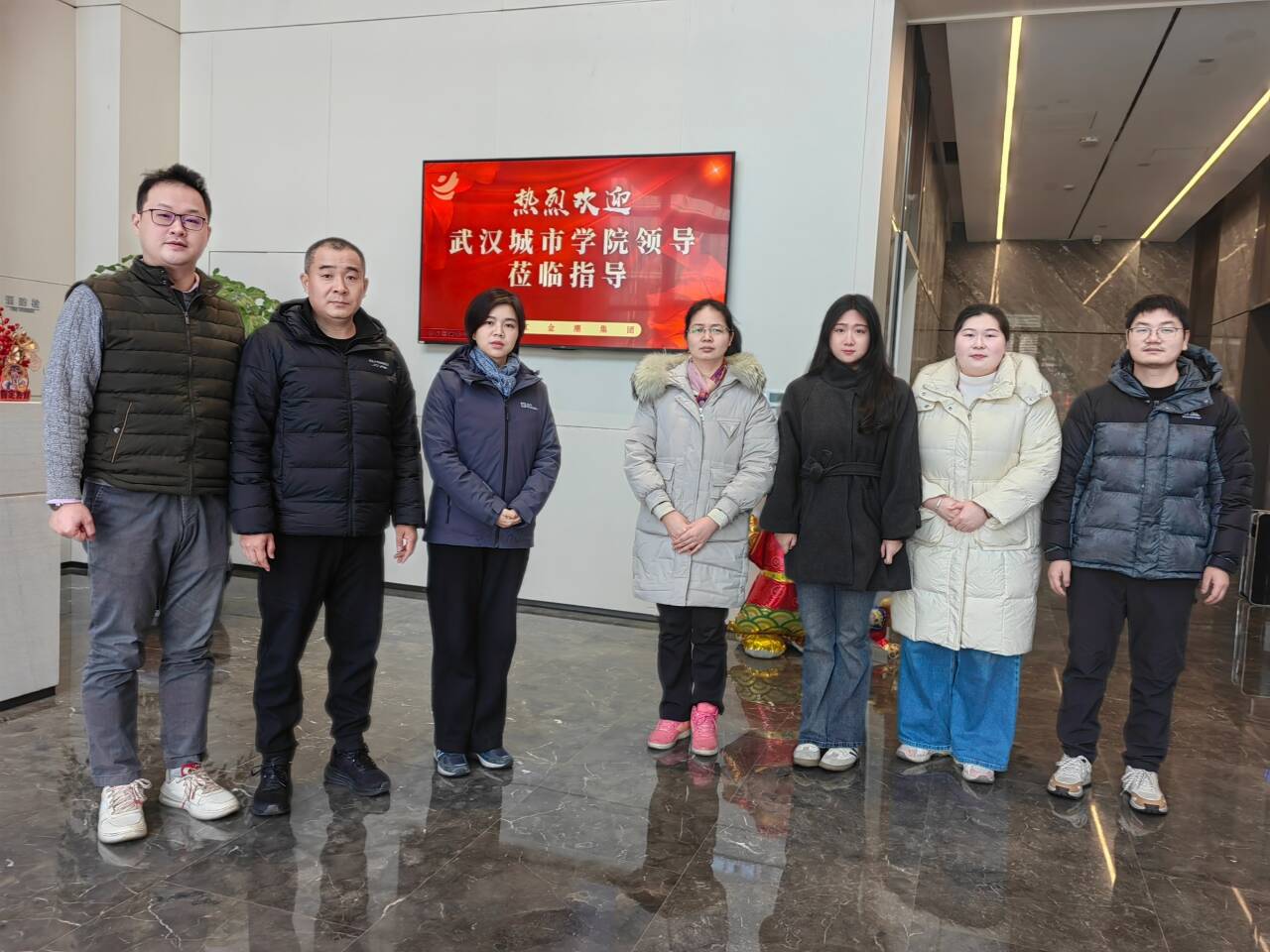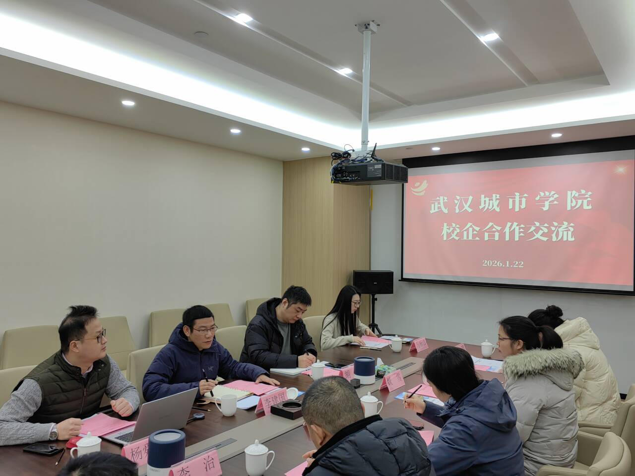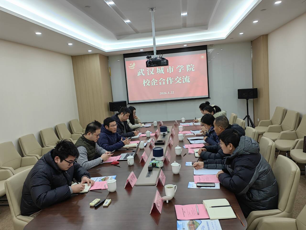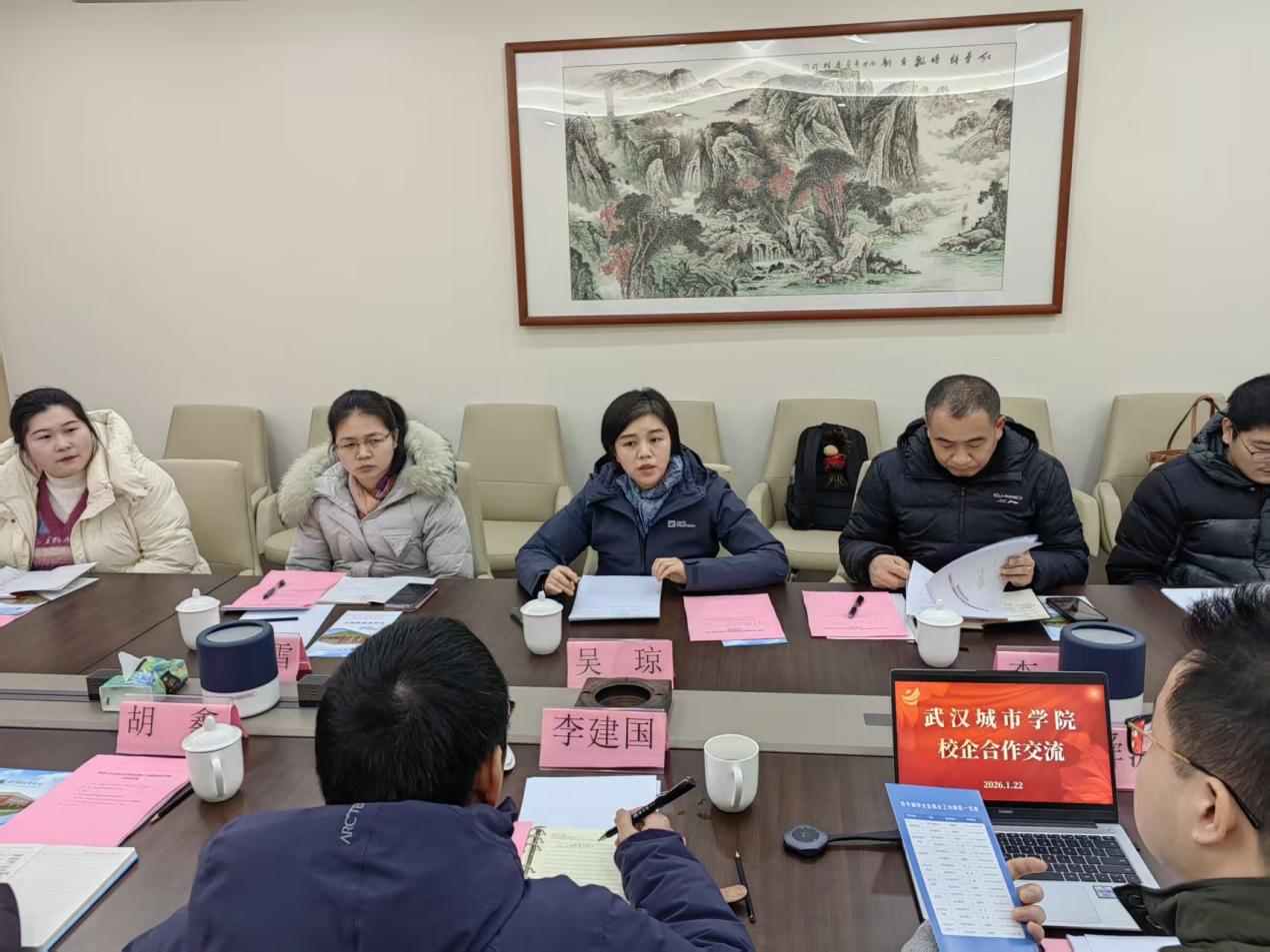 浙江金潮集团董事长李建国、常务副总胡鑫、校园总监杨舜源、办公室副主任马杨洁、校招专员陶开航,武汉城市学院机电工程学部党总支书记吴琼、就业办科长李治、综合科副科长魏雪、就业办科员李志文、辅导员张晨与赵雪吟等共同出席本次会议。