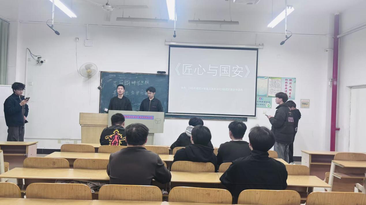 团支部原创编排话剧《匠心与国安》,将机械工匠精神与总体国家安全观有机结合,生动演绎工科青年在科技安全、工业安全、制造安全中的责任担当;随后的主题朗诵围绕机械学子与国家安全展开,铿锵字句彰显“匠心筑梦、国安有我”的青春誓言,现场氛围庄重热烈、催人奋进。