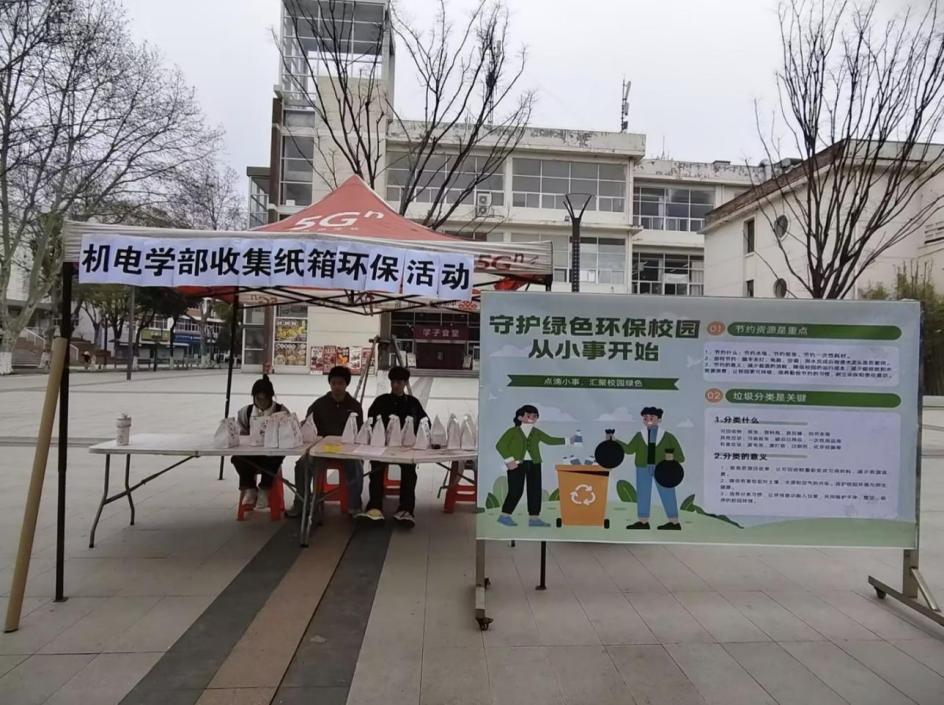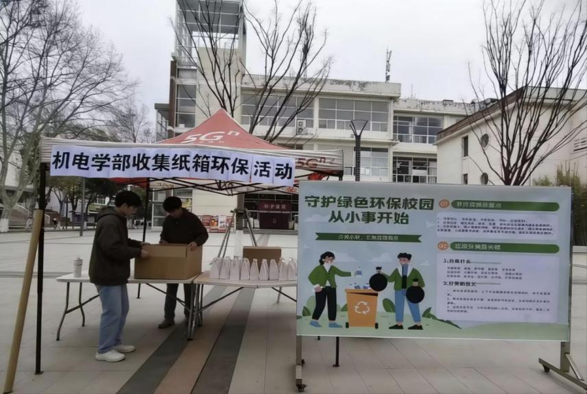 活动现场布置规范有序,“机电学部收集纸箱环保活动”的横幅醒目悬挂。环保宣传展板展示“守护绿色环保校园,从小事开始”主题,解读节约资源、垃圾分类的重要性。志愿者们耐心讲解废旧纸箱、塑料水瓶回收再利用的环保价值,普及资源循环利用、低碳节能生活等知识。