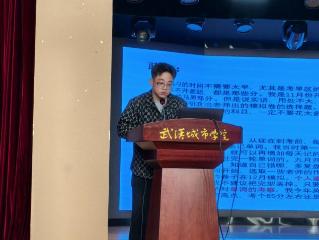多位成功上岸的学长学姐结合自身备考历程,分享了宝贵经验。机械三班毕业生张子浩以优异成绩考取长江大学研究生,他系统介绍了各科备考策略:政治以肖四、肖八为核心进行冲刺;英语注重真题训练和词汇积累;数学跟随张宇老师课程体系,坚持每日练习;专业课则强调必须紧扣目标院校最新考纲。他表示,科学的备考方法与持之以恒的努力是考研成功的关键。学长学姐们用真实的备考故事和实用方法,为在场同学理清了思路、增强了信心。分享过程中,现场同学们专注聆听,认真记录,将宝贵的经验一一记下。