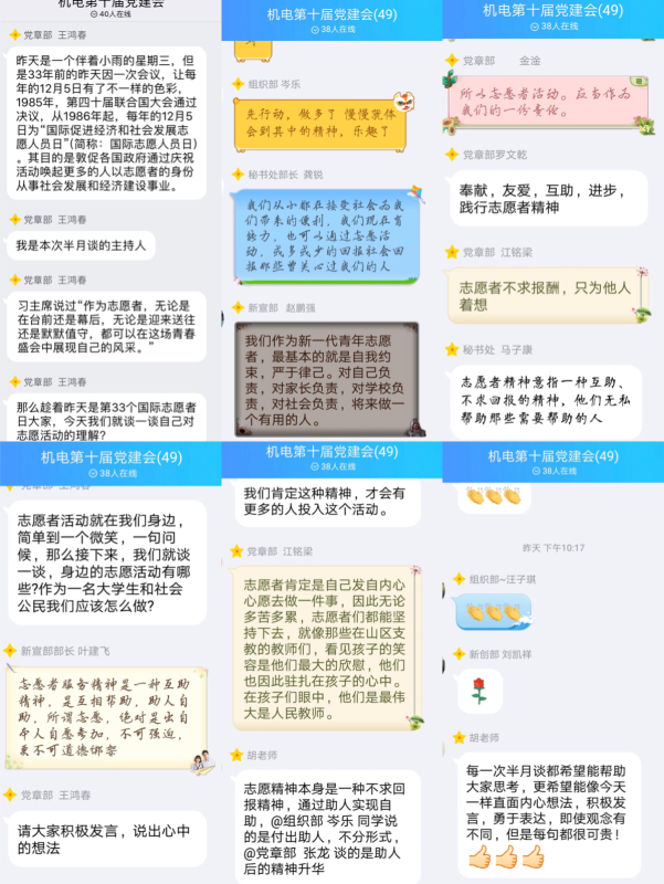 2018年12月06日21:30,机电学部党建会于QQ群开展了以“国际志愿人员日”为主题的第二期线上半月谈,组织同学们围绕志愿服务精神在线上展开讨论,此次半月谈主持人由党章部干事王鸿春担任,党建会指导老师胡萍及全体干部参会。