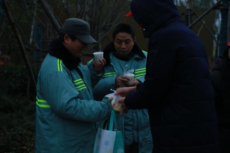 早上6点,天色微亮,寒风瑟瑟,志愿者们在党建会指导老师胡萍的带领下早早地来到食堂拿取早餐和热水,小心翼翼地呵护好爱心物资,脚步坚定地朝着东湖绿道出发。路途中,只有零星的汽车灯光闪过,整齐有序地志愿者们似一道独特的风景线。6:45,这时的绿道已然能看到环卫工人的身影,志愿者们纷纷走向工作的环卫工人们开始微笑服务。热水一杯暖肠胃,早餐一份甜心头,一个接过劳动工具的动作,一句辛苦了,志愿者们皆是传递着最真挚的关怀。一名环卫工阿姨感慨到:“很少有大学生会去主动关心我们,尤其是在这么冷的天,我们的孩子都还在温暖的被窝里睡觉呢!心里真的很感动,很感谢同学们!”一边说一边不肯把抹布给自愿者们,生怕脏了志愿者的手。在冬天刚下过雪的绿道清扫落叶、拖地、擦拭垃圾桶及路灯杆对绝大多数同学来说无疑是巨大的挑战,尽管手已经冻得通红,但他们依旧不畏严寒,一丝不苟的忙碌着,而环卫工人向志愿者们竖起的大拇指、脸上洋溢着的幸福笑容是对他们最大的鼓励及褒奖。活动最后,负责此次活动的胡老师告诉同学们:“关注社会动态、关爱他人是作为学生党员、积极分子应当主动承担起的社会责任,环卫工人干着最脏最苦的活,还常常得不到尊重,他们是城市的英雄,为他们做点力所能及的事是件令人自豪的事!”