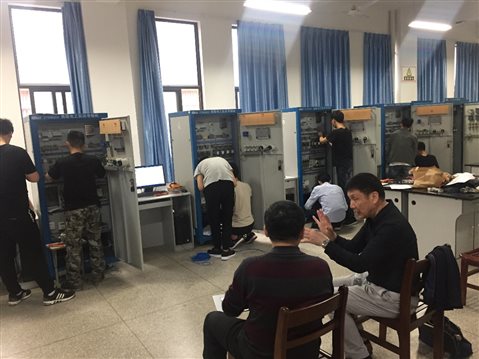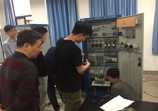 5月15日下午14:00,“现代电气控制系统安装与调试”比赛于图书馆辅楼F305举行,由孙悦院长、周功业主任、钟诚老师担任评委。参赛选手两人一组,共计五组,要求规定时间内在“高级电工实训考核柜”上完成主电路与控制电路部分的接线,并编写出正确的PLC程序,使电动机能够正常正反转运行。经过紧张的角逐,大部分参赛选手先后完成了赛项,使电动机能够按程序正常运转。赛后评委对选手进行点评,肯定了比赛中熟练运用所学知识解决问题,并鼓励选手在今后的学习中深挖专业知识,锻炼实践技能,更好的适应企业需求。