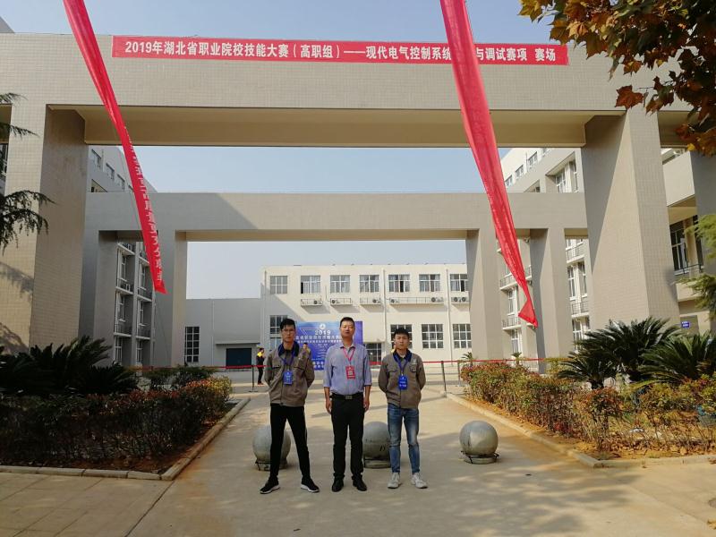 湖北省职业院校技能比赛属于A类赛事,比赛规格高,这也是机电学部学生首次参加该项比赛,共派出2支队伍:推荐队由W17级机电1班胡成龙、樊圣于11月6日比赛,另外一支团队由W17级机电1班王宽、乐有熊组成的随机队于11月7日参赛。参赛团队及指导老师于比赛当天7:00就要到现场录检进场,下午18:00左右考完,比赛时间长,调试难度大,不仅对学生电气控制原理理论知识要求非常高,同时更加注重考查学生的电气系统编程、调试实操能力,本次考试的设备是随机编排,要求学生对各类电气调控设备的熟悉程度极高。