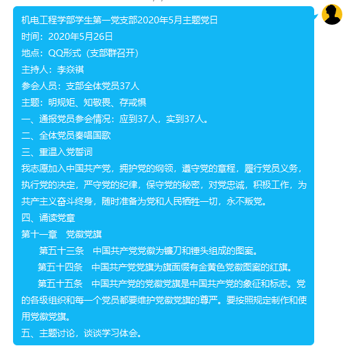(机电工程学部讯 记者:罗昊)2020年5月26日,由李焱祺主持在党支部群里召开了一次主题党日活动,支部全体党员积极参与其中,踊跃发言讨论,活动进展十分顺利,无一人缺席。