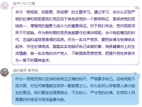 本次活动由于疫情原因采用了线上讨论的形式,主题为“明规矩、知敬畏、存戒惧”,整个活动分为五步骤:通报党员参会情况、全体党员奏唱国歌、重温入党誓词、诵读党章、主题讨论。在主题讨论中电气1701江珊的发言令人印象颇深,她谈到:通过本次学习,充分认识到严明的纪律和规矩是我们党区别于其他党政的一个鲜明特征,是保持党的团结统一,增强党的凝聚力、战斗力的重要保证。对于我们来说,党内规矩须臾不可或缺。作为新时期的党员就要守纪律讲规矩。当今物欲横流的时代,忠诚和诚信是难得的品质。作为一名共产党员,要把自律与他律结合起来,守住纪律底线,踏踏实实地做好自己该做的事,培养健康向上的生活情趣,做一名合格的共产党人,不断提高思想觉悟,把提升党性修养作为一辈子的精神追求。