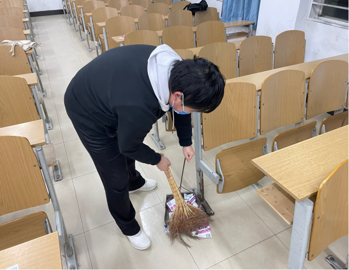 在精彩的团会活动结束后,青年志愿者服务队积极打扫各个班级的活动场地。每个志愿者都认真打扫了同学们进行团日活动后遗留在教室边边角角的垃圾,以及桌椅缝隙间的垃圾,并且清理了各个自习室外的垃圾桶。他们的每一次弯腰都充满了认真与努力,各位志愿者们用认真诚挚的态度对待着本次活动。志愿者们既减轻了保洁阿姨们的工作量,也为同学们带来了一个良好干净的学习环境。通过本次活动,青志队的干事纷纷表示,保洁阿姨工作的辛苦与不易。作为大学生,我们应该主动爱护环境,积极地为校园清洁工作出一份力。