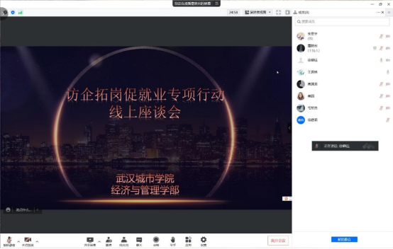 (经管党建讯记者 支星宇)为贯彻落实党中央、国务院关于高校毕业生就业工作的决策部署,进一步访企拓岗,5月23日晚上7:30,武汉城市学院党委书记王军教授、经管学部副书记毛军杰、综合科科长高园、创新创业教师代表徐德钰、辅导员代表徐建莉老师、学生代表蹇映宏等与荆门市翠彩生态养殖有限公司总经理王居林先生在腾讯会议上开展了线上座谈。本次会议由我校创新创业教师代表徐德钰老师主持。