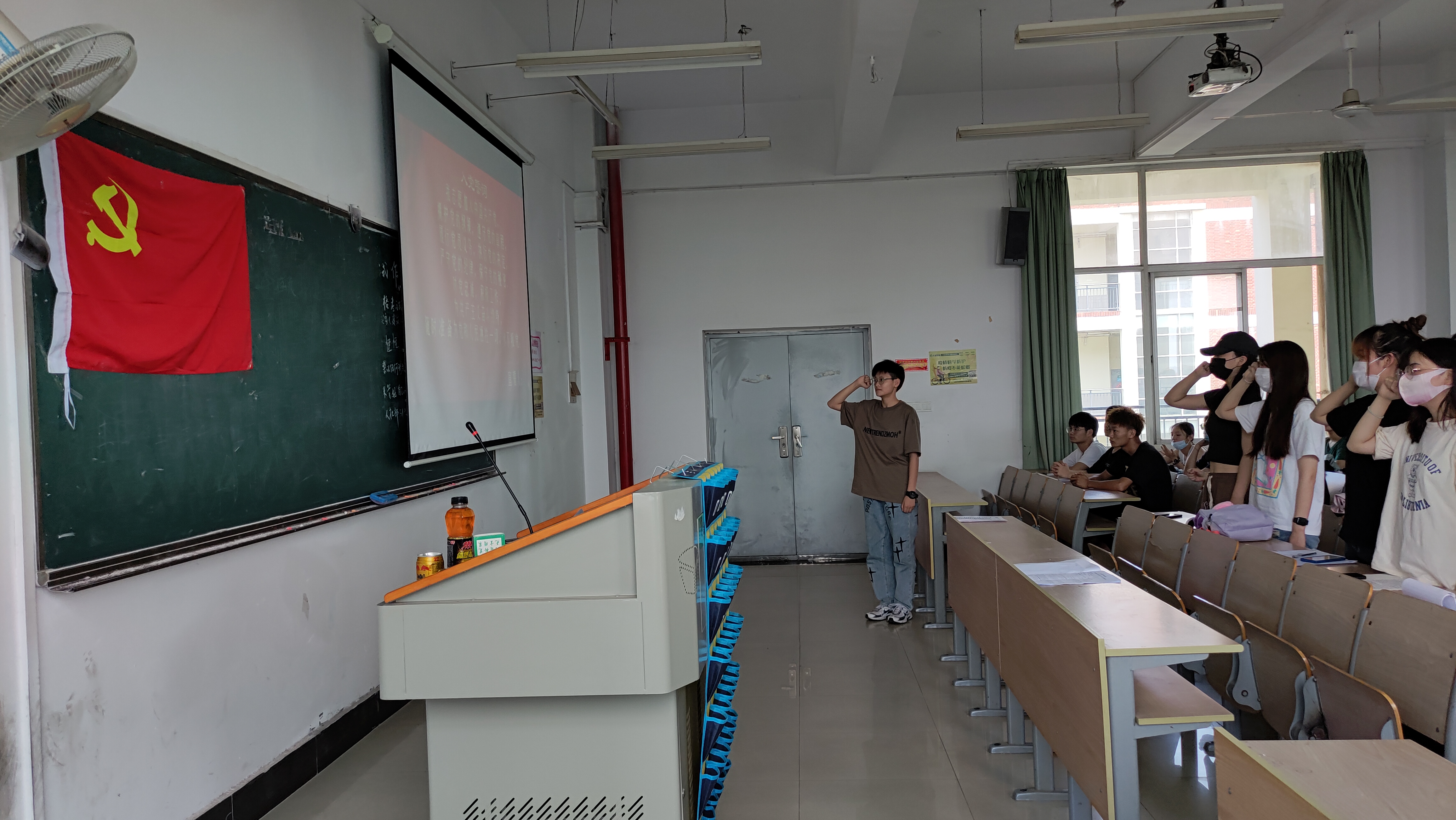 党旗熠熠映初心,誓言铿锵筑忠诚。在庄严的宣誓仪式上,首先由党建会会长周唯在宣誓前深情致辞,稍后伴随着雄伟、嘹亮的《中华人民共和国国歌》,全体人员行注目礼,礼毕之后,在仪式上预备党员还对疫情中人民生命安全与经济发展的取舍,阐述了讨论成果:中国共产党人的初心就是为中国人民谋幸福,为中华民族谋复兴。“不忘初心,牢记使命”就是要让全党永葆这样的初心,朝着人民所愿、人民所盼、人民所需,去肩负起时代赋予我们的使命任务和历史责任……。 “我志愿加入中国共产党,拥护党的纲领,遵守党的章程,履行党员义务……”面向鲜红的党旗郑重宣誓,预备党员高举右臂,紧握右拳,神情严肃,一句句铿锵有力的承诺,一声声发自肺腑的誓言在教室久久回荡,向党组织表达自己坚定的决心和不变的信念,用高昂、奋进的声音,传递着党员决心和担当,表达着党员的无悔与坚守。