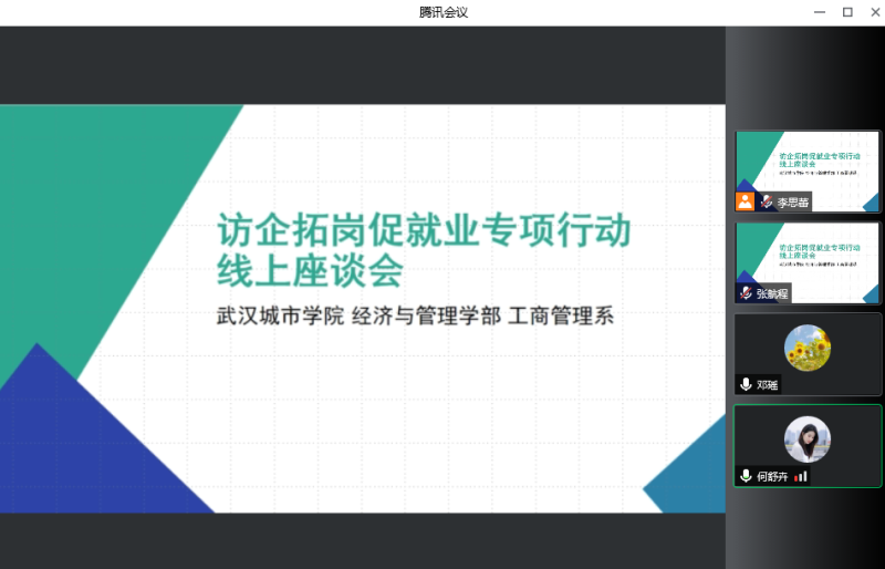 为贯彻落实党中央、国务院关于高校毕业生就业工作的决策部署,进一步访企拓岗,7月10日晚上19:00,武汉城市学院党委书记王军教授,经济与管理学部工商管理系主任何舒卉、工商管理系教师张航程、李思蕾等与武汉链家宏业房地产经纪有限公司在腾讯会议上开展了线上座谈。本次会议由工商管理系主任何舒卉老师主持。