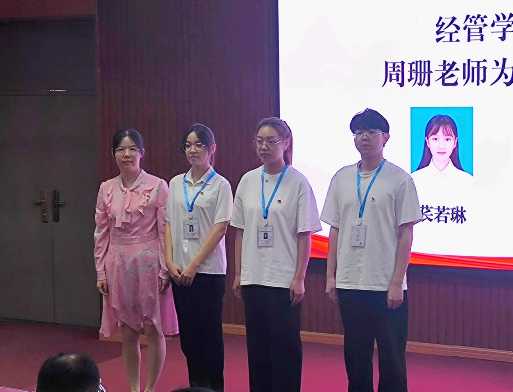 大会开始第一项,全体起立奏国歌,大会在庄严的国歌声中拉开帷幕,伴随着这庄严的国歌声,我们激情澎湃。紧接着,由经管分团委书记陈盈君老师宣读任命书及表彰决定,部分学生会优秀骨干被授予优秀骨干工作牌。经管学部综合办主任周珊老师也同样上台宣读了任命书及表彰决定,并为党建会会长团张婷婷、苌若琳、柳雨航三人授牌,伴随着此次荣誉的还有第十四届经管学部党建会骨干和全体干事。随后,党建会会长苌若琳作为代表上台发表演讲并做出了学年规划,其内容主要围绕党建会今后工作内容、工作态度及对学校安排的积极响应。此外,党建会新晋干事代表罗杨上台发表了激情的演讲,并表达了对今后工作的不断完善,积极进取的工作态度。伴随大会进行的还有学生会、党建会肃穆而庄严的宣誓,这些誓词激发出全体同学认真而热血的激情。最后,学部党总支副书记毛军杰主任对此次大会做出了总结,在发言中对本次大会受表彰的人员表示祝贺,并对学校工作的情况给予肯定,加大对优秀先进学生的表彰力度及对党建会学生会未来工作提出设想。