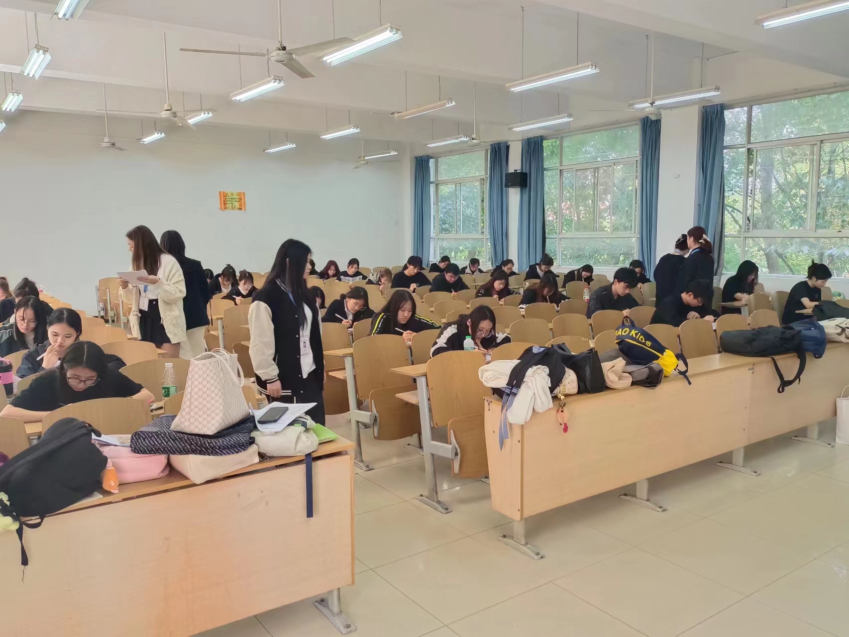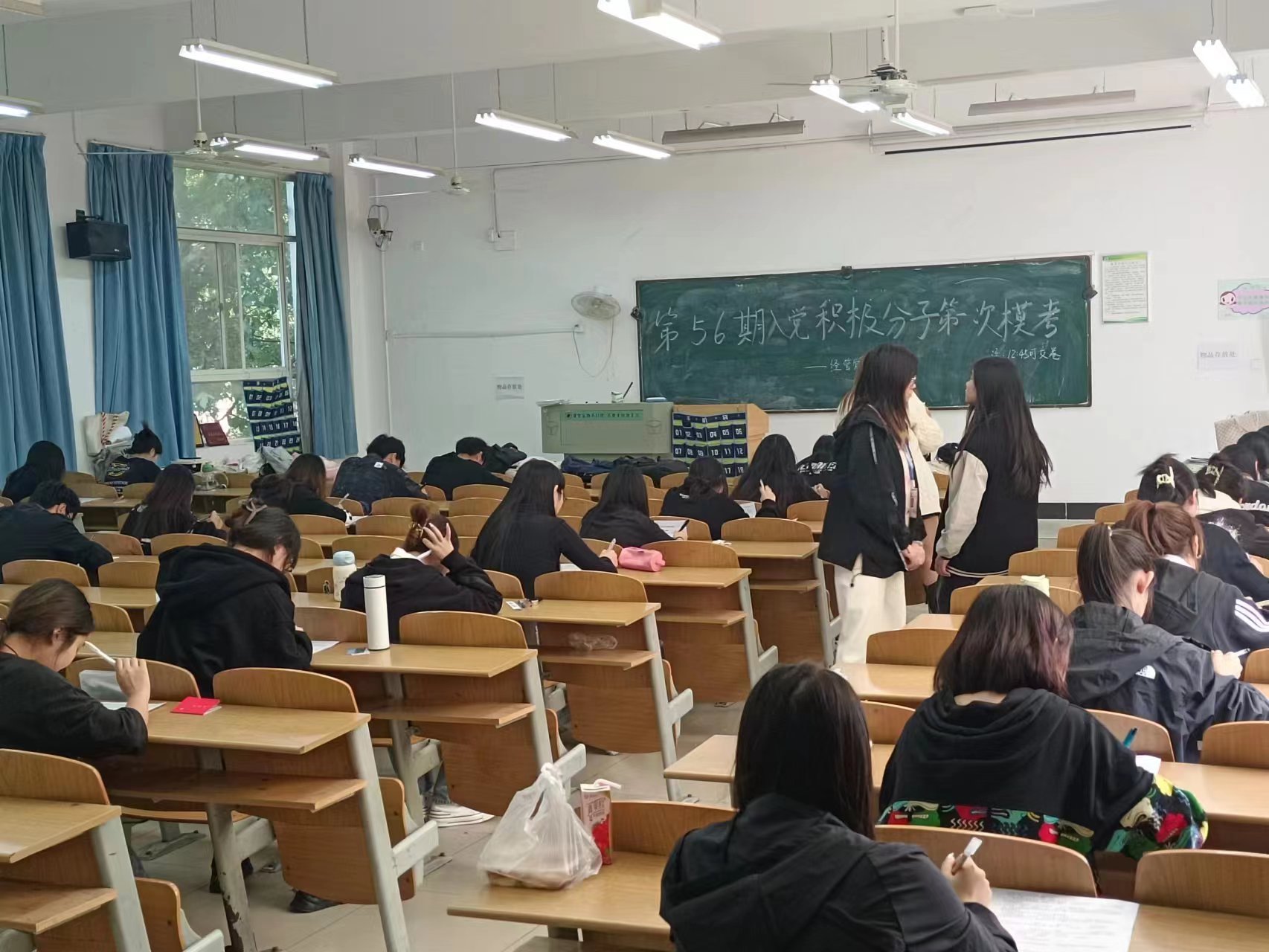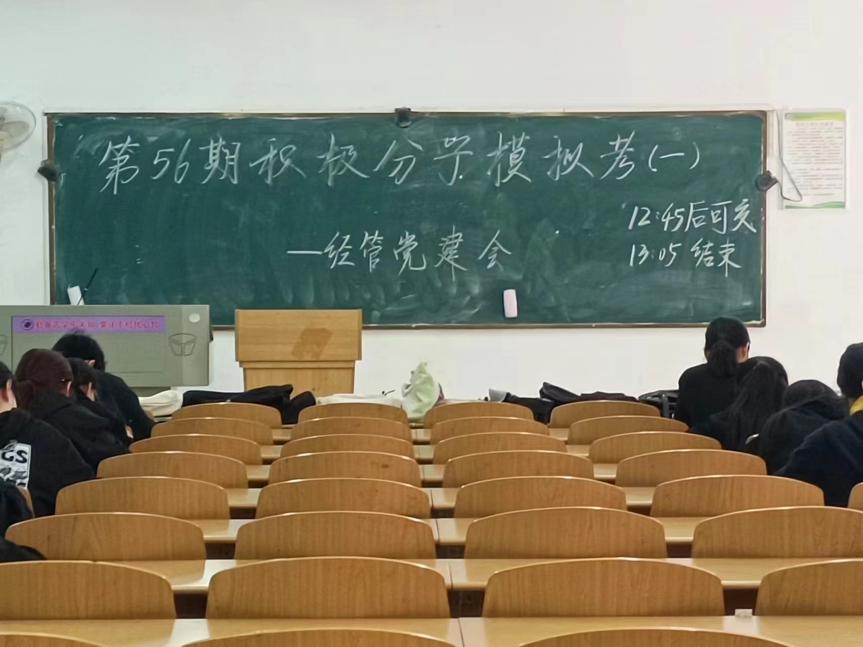 2023年10月20日中午十二点零五分,为考查积极分子在党课学习中对党的理论知识的掌握的基本程度,武汉城市学院经济与管理学部党建会在南4204、南4205开展党课考试。此次考试在党章学习督察部的安排下顺利展开,第56期积极分子无一缺席。