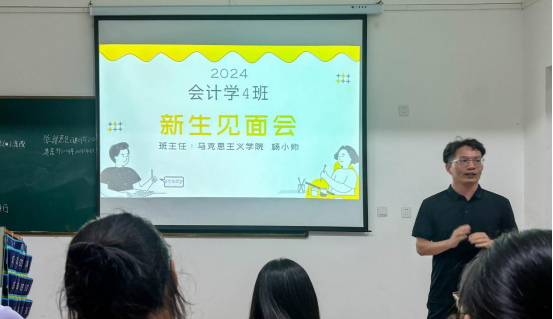 新闻网讯(实习记者 符传宝)10月14日,我校经济与管理学部会计四班班主任杨小帅老师在晚自习教室5j-304开展了与同学们的第一次新生见面会。